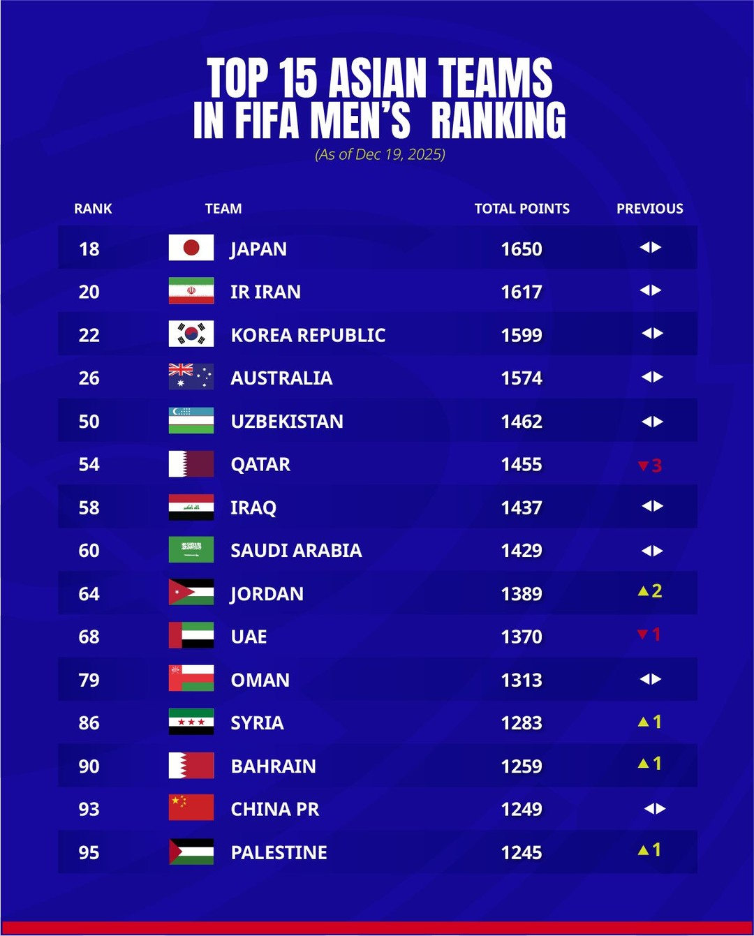 아시아에서는 일본, 이란, 한국에 이어 호주, 우즈베키스탄, 카타르, 이라크, 사우디아라비아, 요르단, 아랍에미리트연합(UAE) 순으로 톱10을 유지했다. 중국은 전체 93위, 북한은 119위다.