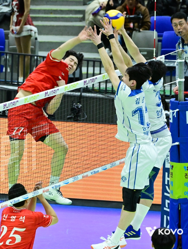한국전력은 23일 경기도 수원실내체육관에서 열린 대전 삼성화재와 진에어 2025~2026 V리그 홈경기에서 세트스코어 3-2(25-27, 25-19, 23-25, 25-15, 19-17)로 이겼다.