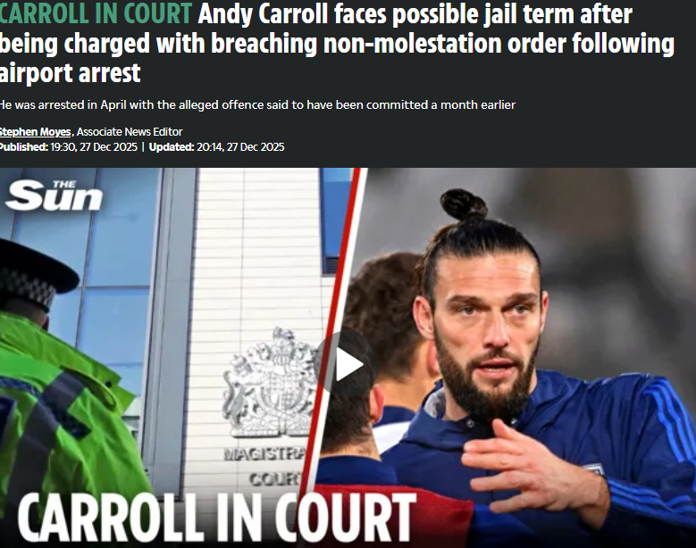 잉글랜드 국가대표 출신 공격수의 몰락이다. 앤디 캐롤(36·대건햄 앤 레드브리지)이 접근 금지 명령 위반 혐의로 기소되어 법정에 서게 됐다.