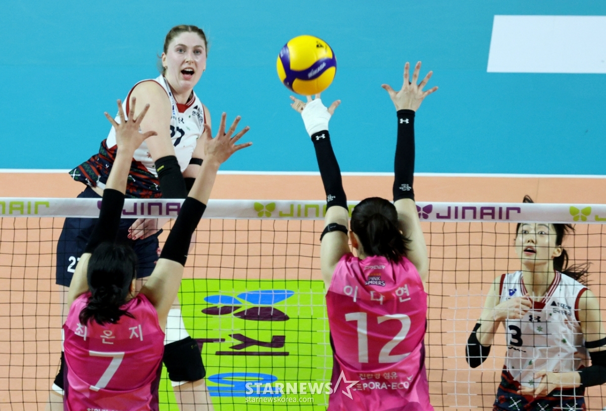 현대건설 카리가 2025년 마지막날인 31일 인천삼산체육관에서 열린 2025-2026 진에어 V리그 여자부 현대건설과 흥국생명 경기에서 흥국 이다현 최은지 블로킹 위로 강타를 터트리고 있다. 2025.12.31.