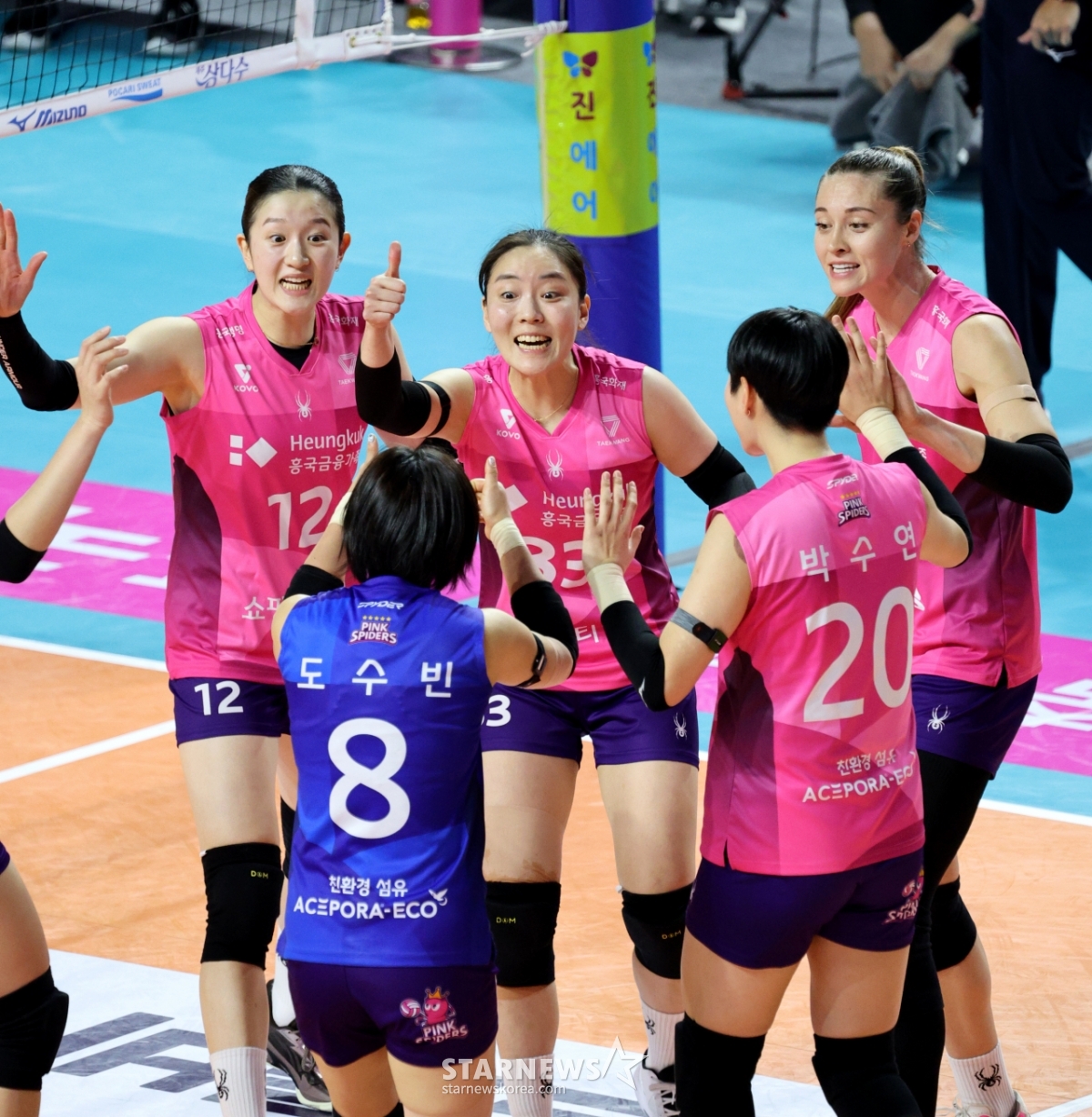 흥국 세터 이나연이 2025년 마지막날인 31일 인천삼산체육관에서 열린 2025-2026 진에어 V리그 여자부 현대건설과 흥국생명 경기에서 리베로 도수빈에 엄지척을 하고 있다. 2025.12.31.