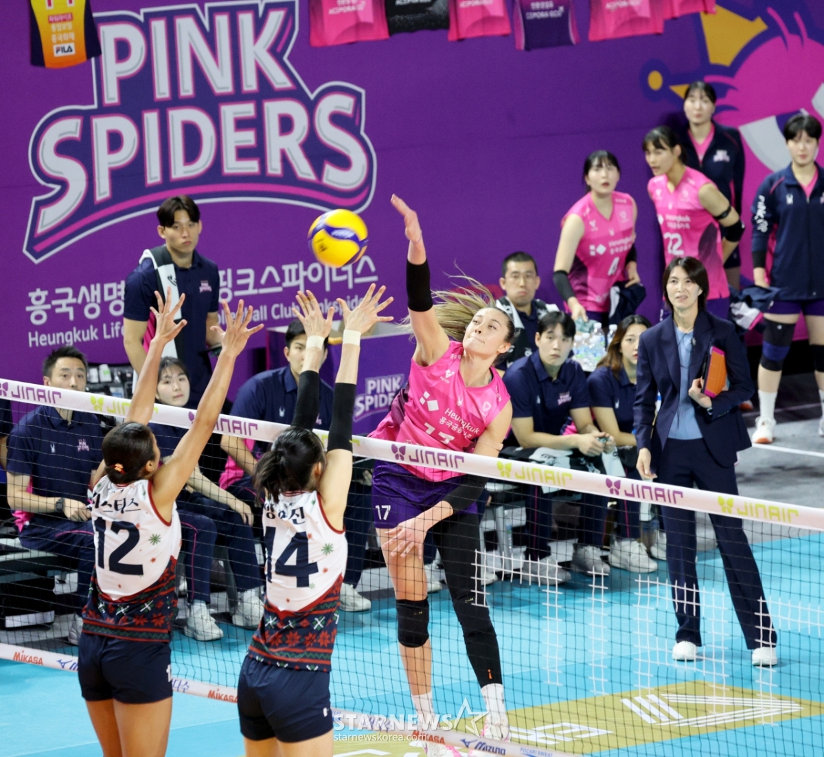 흥국 레베카가 2025년 마지막날인 31일 인천삼산체육관에서 열린 2025-2026 진에어 V리그 여자부 현대건설과 흥국생명 경기에서 현대 이중블로킹위로 강타를 터트리고 있다. 2025.12.31.