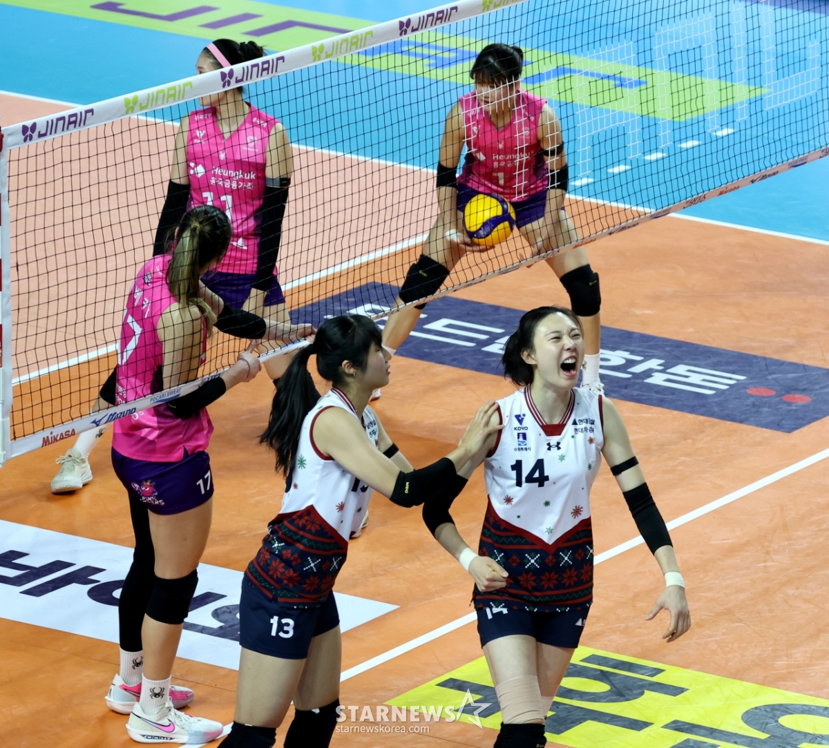 현대 양효진이 2025년 마지막날인 31일 인천삼산체육관에서 열린 2025-2026 진에어 V리그 여자부 현대건설과 흥국생명 경기 5세트 마지막 매치포인트를 블로킹으로 따낸 후 환호하고 있다. 2025.12.31.