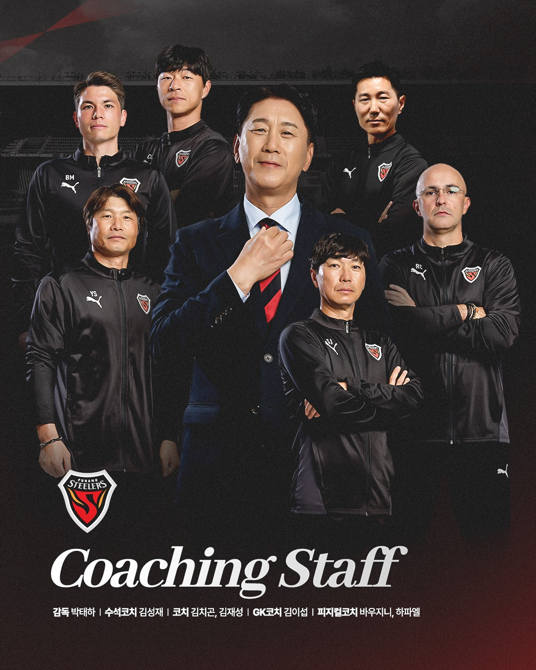 포항은 박태하 감독과 함께 김성재 수석코치, 김치곤 코치, 김이섭 골키퍼 코치, 바우지니 피지컬 코치와 하파엘 피지컬 코치가 지난 시즌에 이어 선수단을 지도한다. 올해 새롭게 김재성 코치가 합류하고, 이규용 코치는 유소년 스카우터로 보직을 변경해 배슬기 스카우터와 함께 일한다.