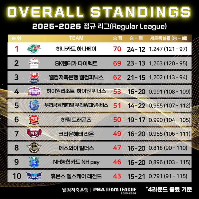 반면 최하위 휴온스 헬스케어 레전드(승점 43)는 4위 하이원리조트와 승점 차가 10까지 벌어져 있다. 최종 순위보다는 우승 한 방으로 포스트시즌 진출을 노리는 게 현실적일 수 있다.