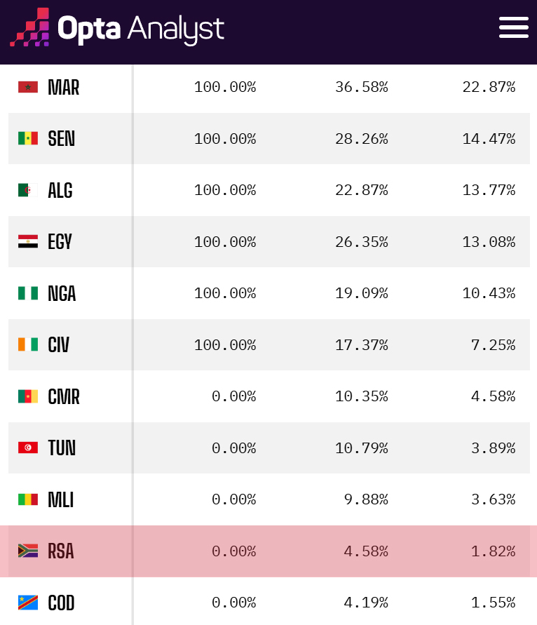 축구 통계 매체 옵타가 2일(한국시간) 업데이트한 아프리카 네이션스컵 우승 확률에 따르면 남아공은 전날 1.95%에서 1.82%로 0.13%p 더 줄었다. 16강에 오른 팀들 가운데 우승 확률이 2%도 채 안 되는 건 그만큼 다른 팀들에 비해 객관적인 전력이 크게 떨어진다는 의미로도 해석할 수 있다. 대회 우승 확률은 모로코(22.87%)가 가장 높고 세네갈(14.47%), 알제리(13.77%), 이집트(13.08%), 나이지리아(10.43%), 코트디부아르(7.25%) 순이다.