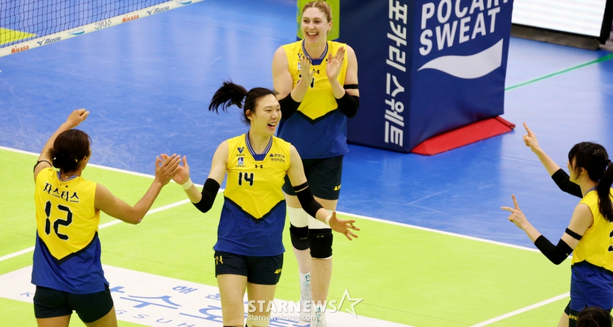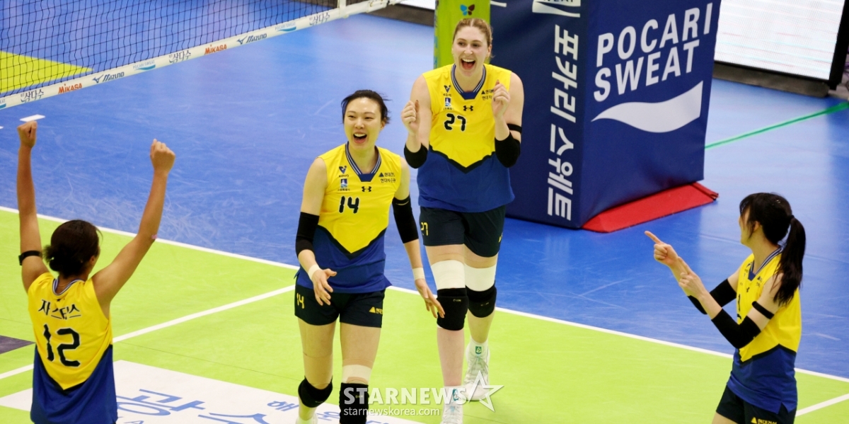 양효진과 카리가 3일 수원체육관에서 열린 2025-2026 진에어 V리그 여자부 현대건설과 GS칼텍스 경기에서 득점한 후 환호하고 있다. 2026.01.03.