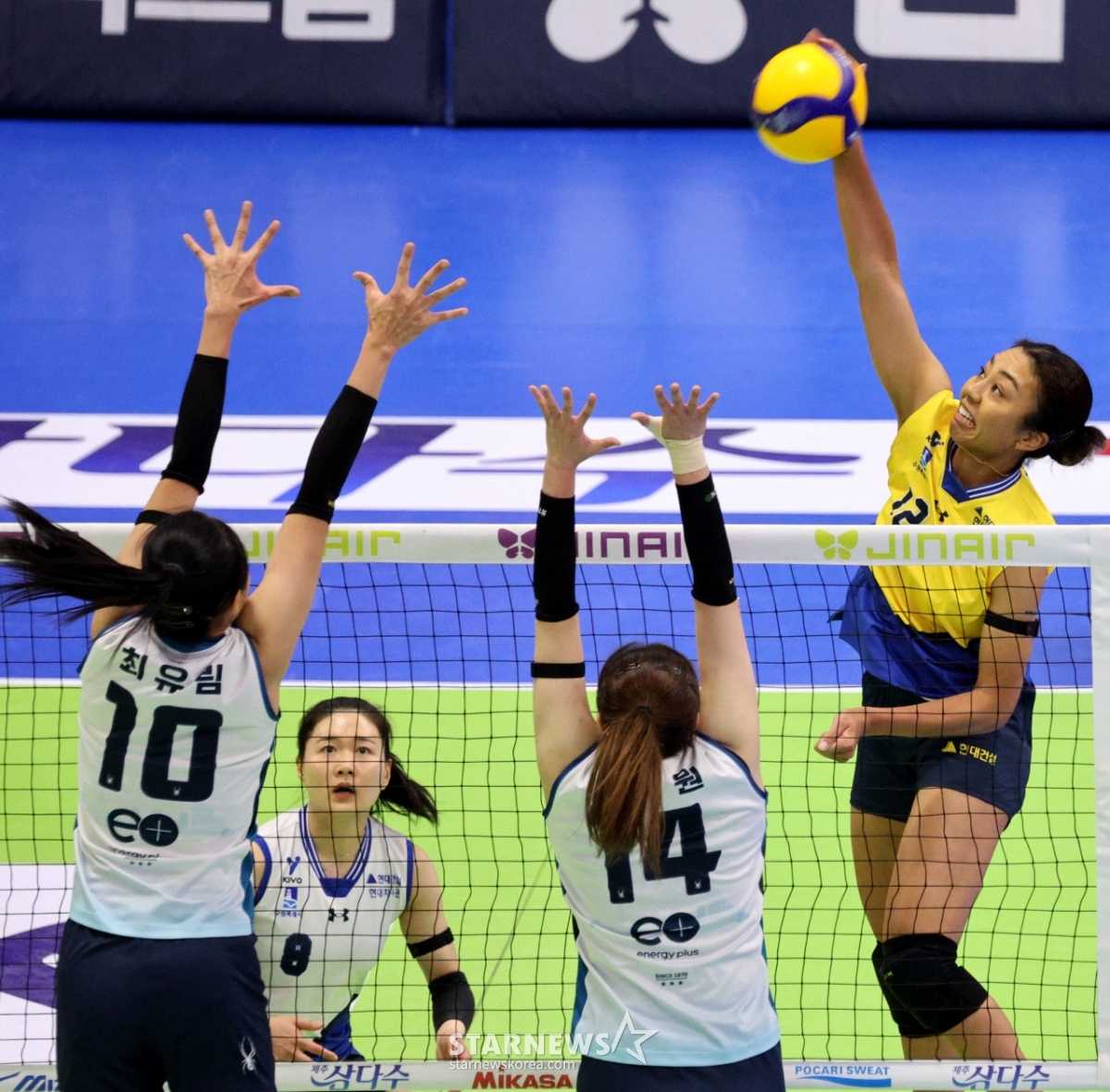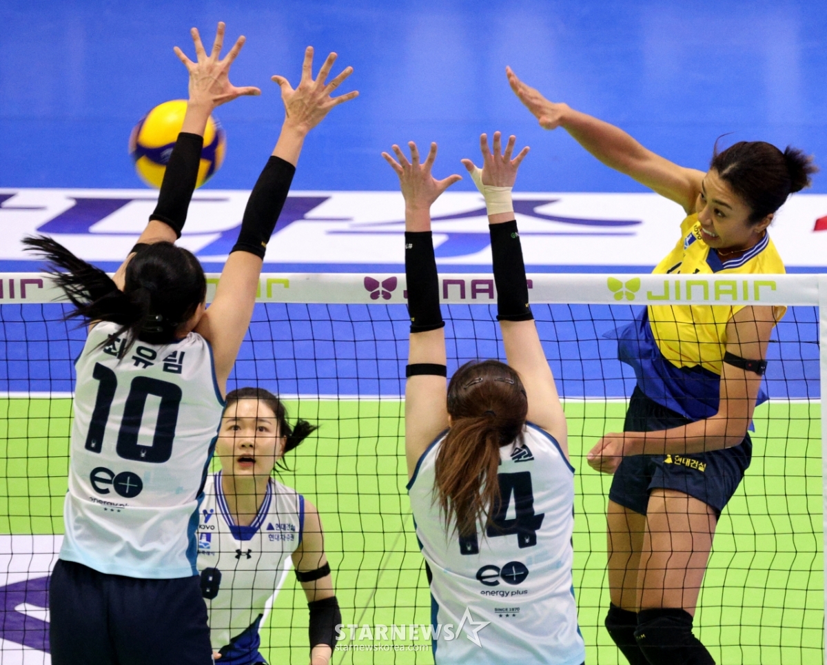 현대건설 자스티스가 2026년 1월 3일 수원체육관에서 열린 2025-2026 진에어 V리그 여자부 현대건설과 GS칼텍스 경기에서 GS 블로킹에 강타를 시도하고 있다.