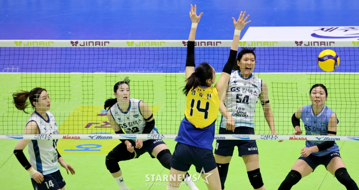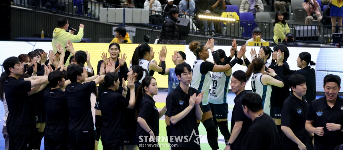 새해 첫경기에서 9연승에 도전한 현대건설은 피로가 쌓인듯 GS에 무너졌다. 세상을 다 가진 듯 신나게 승리를 자축하는 GS선수들의 모습과 생생한 현장을 사진으로 엮어봤다. 2026.01.03.