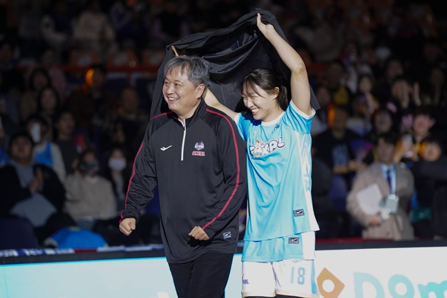 연례행사라 할 수 있는 감독들의 코트 투입도 이어졌다. 2쿼터 초반 박소희(하나은행)가 마이크를 잡고 이상범 감독을 소환했다. 박소희는 이 감독과 매치에서 아이솔레이션을 성공시켰고, 하프라인에서 볼을 스틸해 속공 득점도 올렸다. 여자농구 부임 후 첫 올스타전에 나선 이 감독은 호된 신고식을 치렀다.