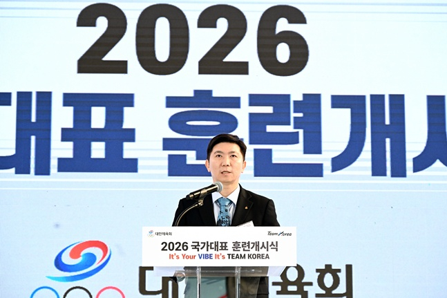 최휘영 문화체육관광부 장관은 7일 진천국가대표선수촌에서 열린 '2026 국가대표 훈련개시식'에 참석해 국가대표 선수단을 격려하고 체육인들과 새해 인사를 나눴다고 문체부가 전했다.