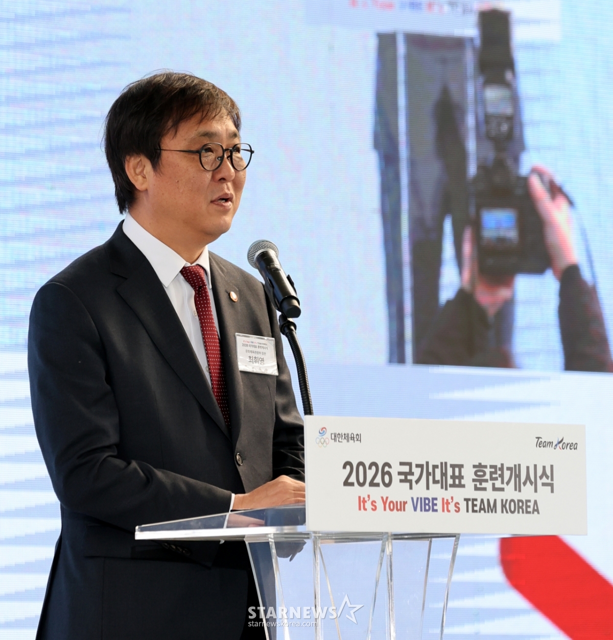 최휘영 문화체육관광부 장관이 7일 진천국가대표훈련장에서 열린 2026 국가대표 훈련개시식에서 인사말을 하고 있다. 2026.01.03.