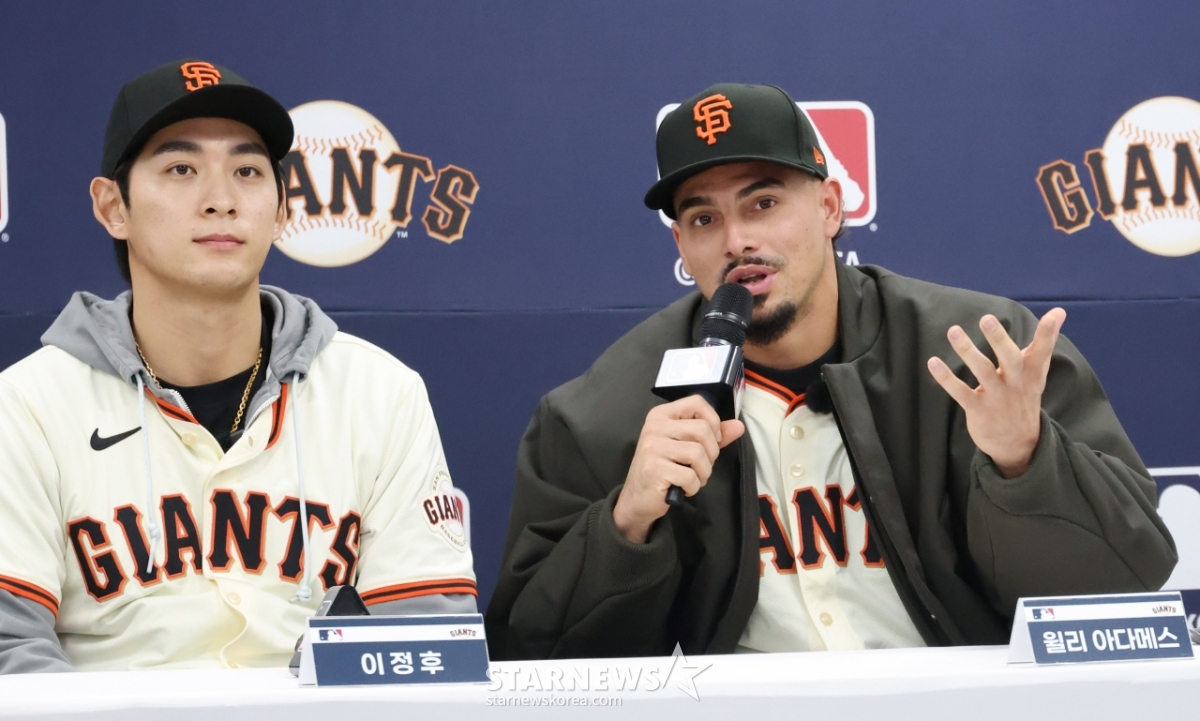 윌리 아다메스가 클리닉 전에 진행된 기자회견장에서 인사말을 하고 있다. 이날 행사에는 래리 베어 회장, 버스터 포지 사장, 토니 바이텔로 감독, 이정후, 윌리 아다메스 등이 참석했다.