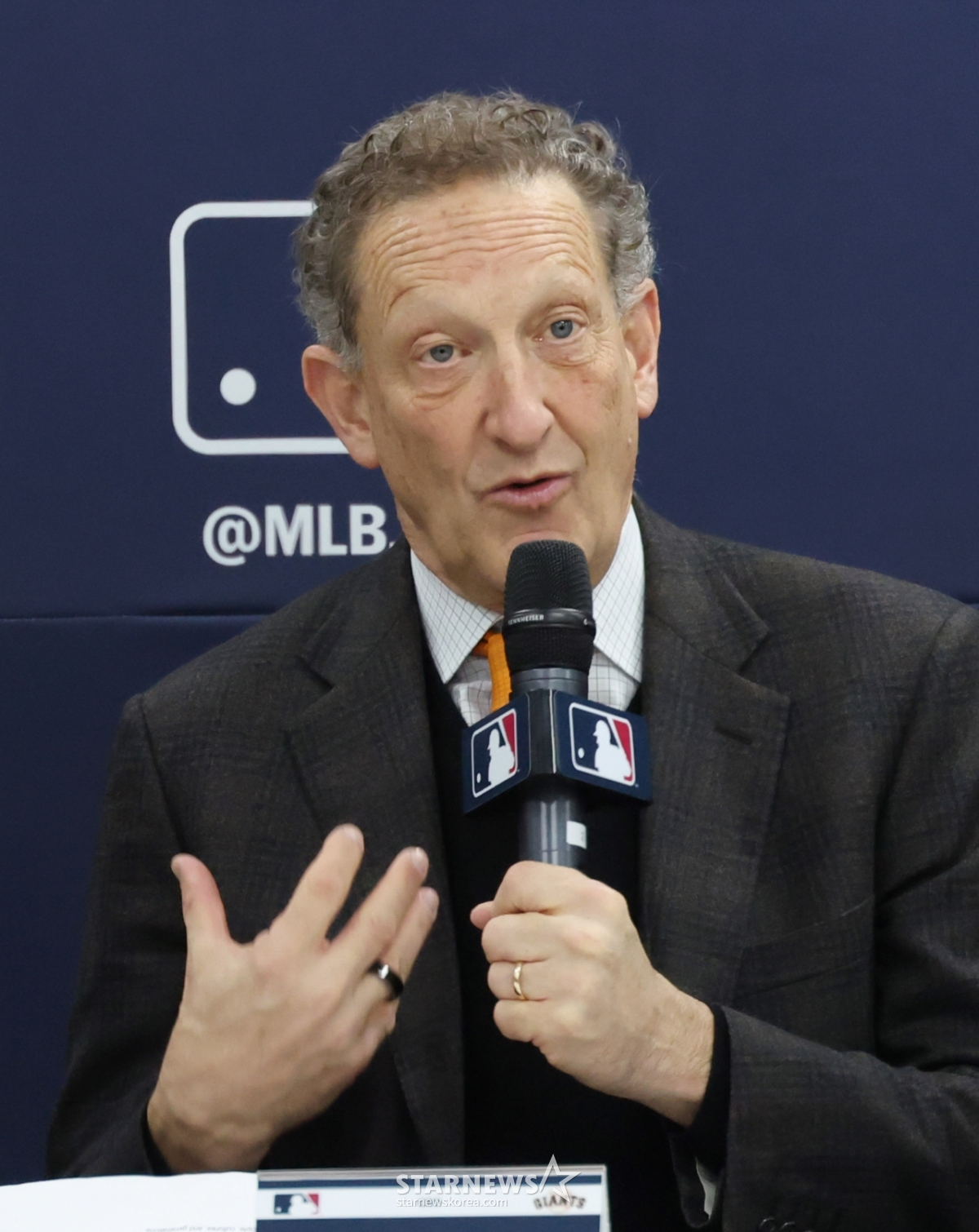 래리 베어 회장 클리닉 전에 진행된 기자회견에서 기자들의 질문에 답하고 있다. 이날 행사에는 래리 베어 회장, 버스터 포지 사장, 토니 바이텔로 감독, 이정후, 윌리 아다메스 등이 참석했다.