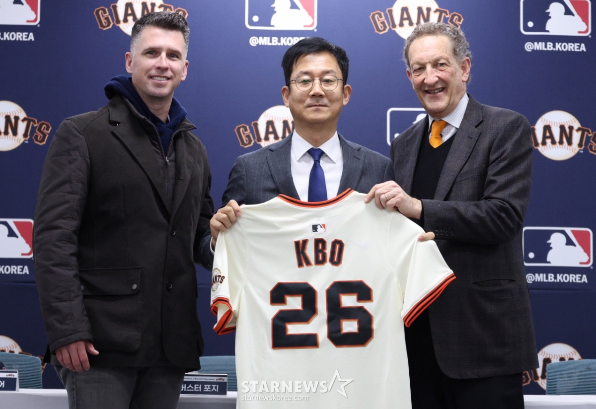 박근찬 KBO 사무총장이 버스터 포지 사장(왼쪽)과 래리 베어 회장에 KBO 유니폼을 전달한 후 기념촬영을 하고 있다.