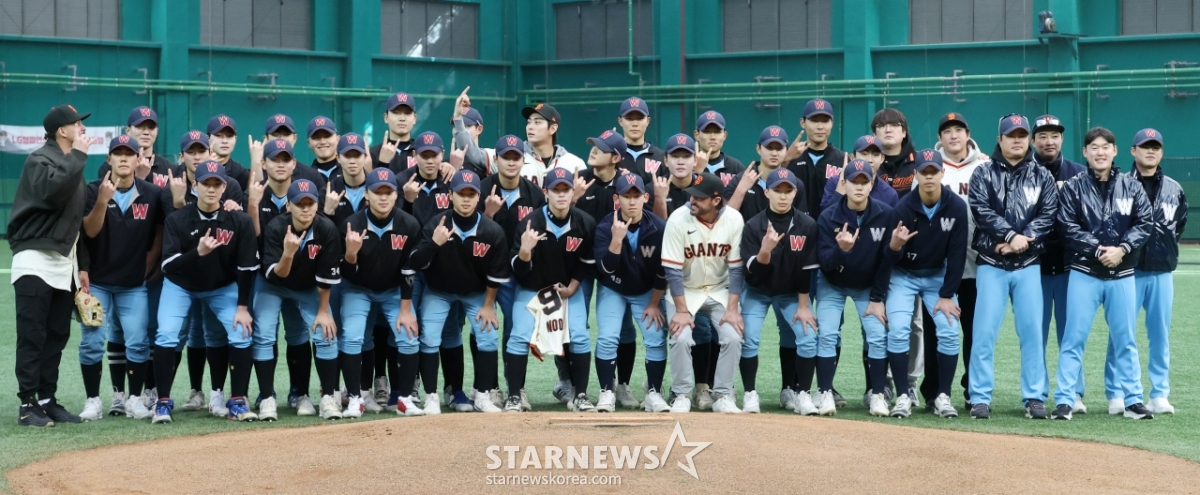 미국 메이저리그 프로야구 샌프란시스코 자이언츠가 7일 경기도 이천 LG 챔피언스파크에서 휘문고 및 덕수고 선수 60여 명을 초청해 야구 클리닉을 개최했습니다. 이정후가 휘문고 주장 유재민에게 유니폼을 전달하며 기념촬영을 했고, 래리 베어 회장, 버스터 포지 사장, 토니 바이텔로 감독, 이정후, 윌리 아다메스, 황재균 등이 참석했습니다.