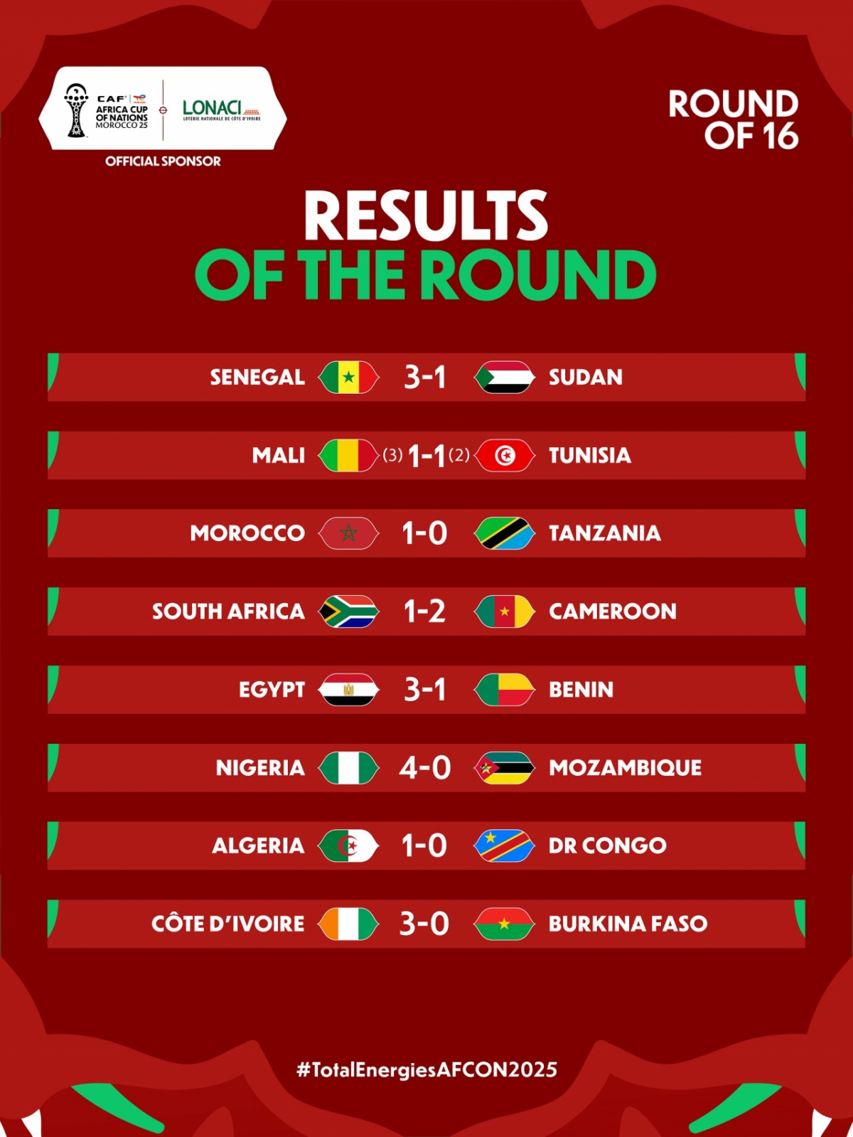 아프리카 최강팀을 가리는 2025 아프리카축구연맹(CAF) 아프리카 네이션스컵 8강 대진이 확정됐다. 2026 국제축구연맹(FIFA) 북중미 월드컵에서 한국·일본과 같은 조에 속한 팀들은 모두 16강에서 '조기 탈락'했다.