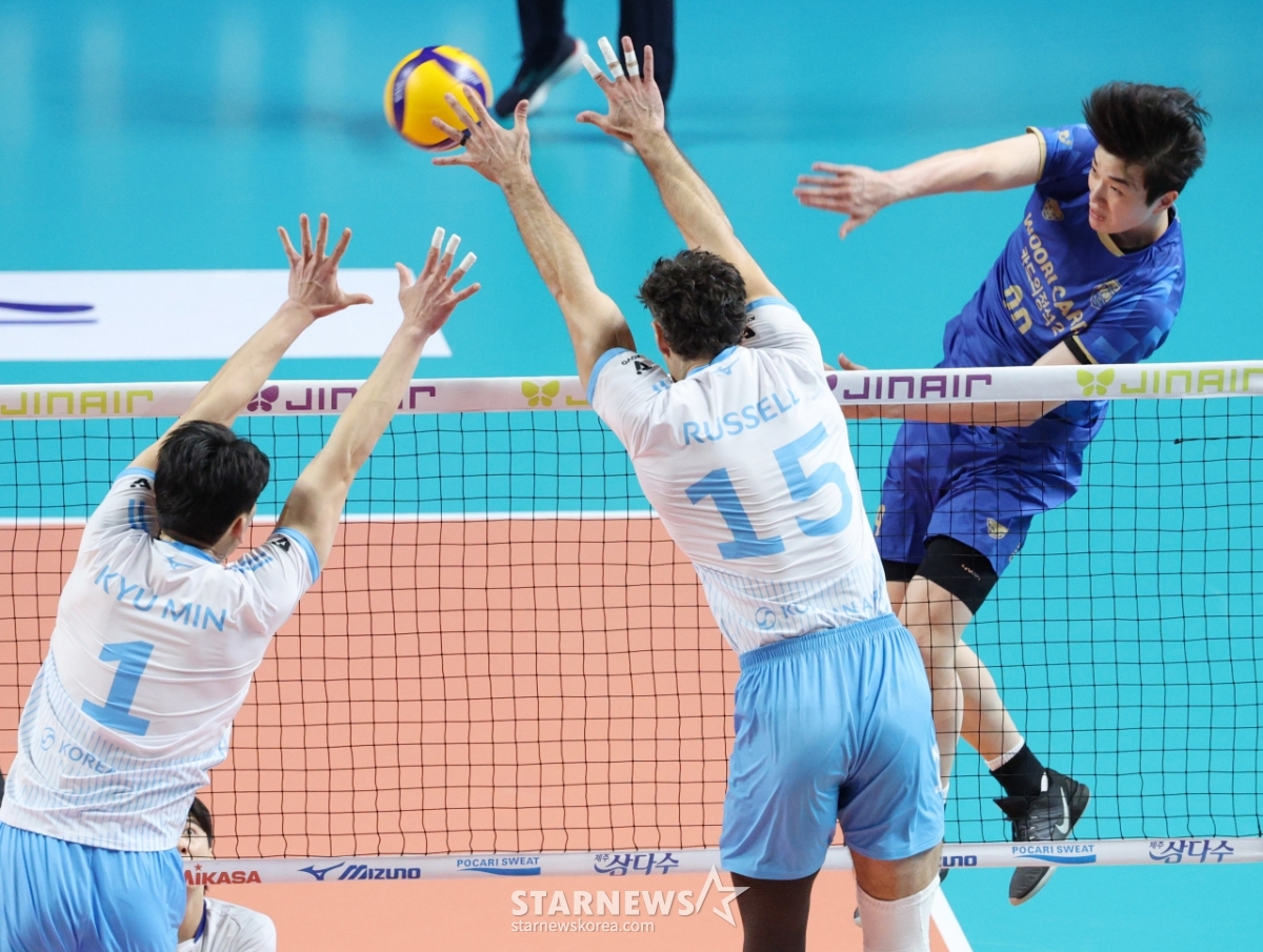 스포츠일반[포토] 김지한 '검객의 사이드 어택'발행 : 2026.01.08 ・ 19:53장충=김진경 대기자2025-2026 V-리그 남자부 우리카드 대 대한항공 경기가 8일 서울 장충체육관에서 열렸다.우리카드 김지한이 대한항공김규민, 러셀의 블로킹 위로 강스파이크를 날리고 있다.<저작권자 © 스타뉴스, 무단전재 및 재배포 금지>프로배구V리그조원태대한항공우리카드아라우조추천 기사김진경 대기자기자홈좋아요 스포츠-일반의 인기 급상승 뉴스스포츠-일반의 최신 뉴스