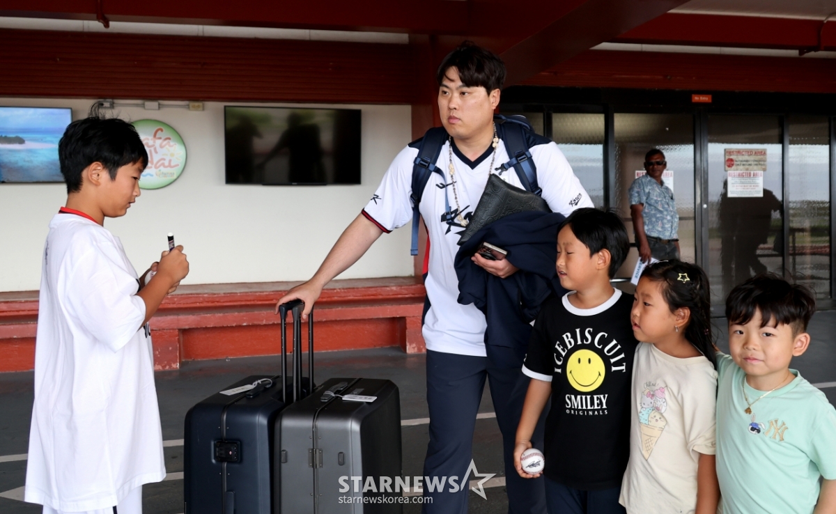 야구대표팀 류현진이 9일 인천공항을 통해 WBC 1차 전지훈련지인 사이판으로 입국한 가운데 그를 기다리던 어린이팬들에게 사인과 사진촬영에 응하고 있다. 2026.01.09.