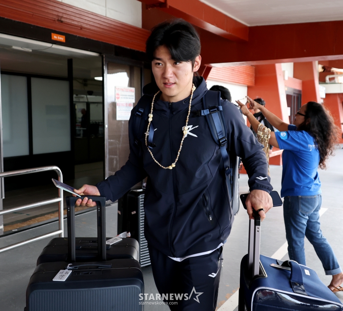 야구대표팀 김도영이 9일 인천공항을 통해 WBC 1차 전지훈련지인 사이판으로 입국한 가운데 웰컴목걸이를 선물받고 있다. 2026.01.09.
