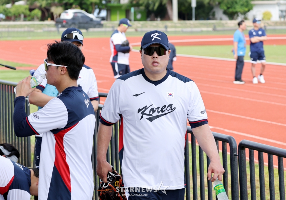 야구대표팀 류현진이 10일 사이판 올레아이 스포츠 컴플렉스에서 열리는 전지훈련 첫날 투수조 훈련을 하며 잠시 휴식을 취하러 이동하고 있다.. 2026.01.10.