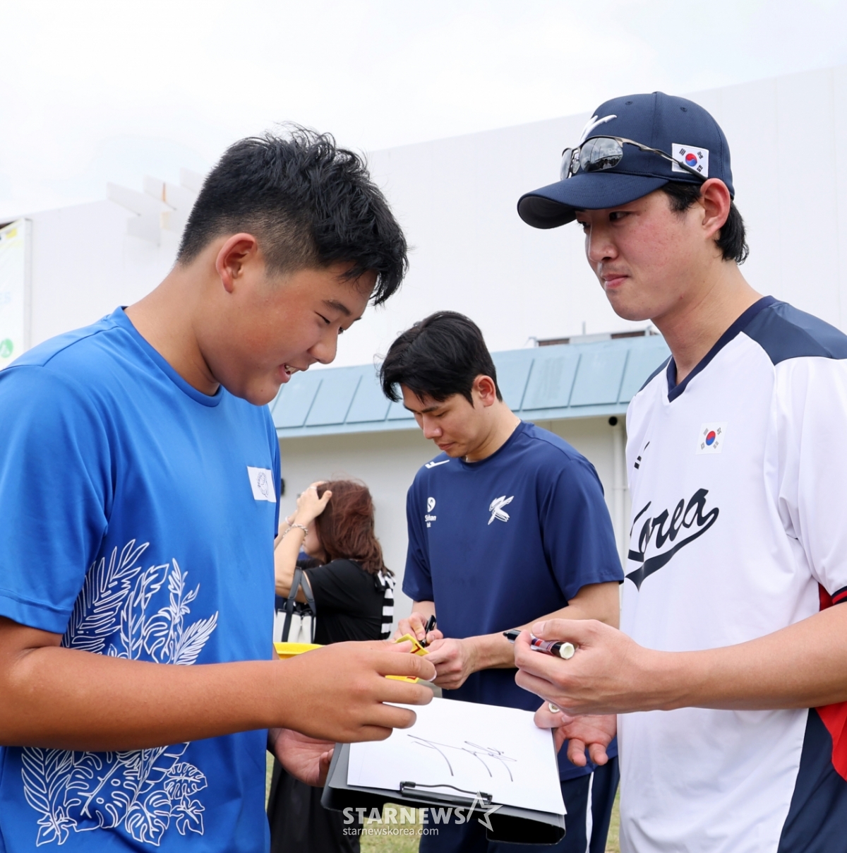 야구대표팀 구자욱과 홍창기가 10일 사이판 올레아이 스포츠 컴플렉스에서 전지훈련 첫날 훈련을 마치고 팬들에게 사인과 사진촬영에 응했다.