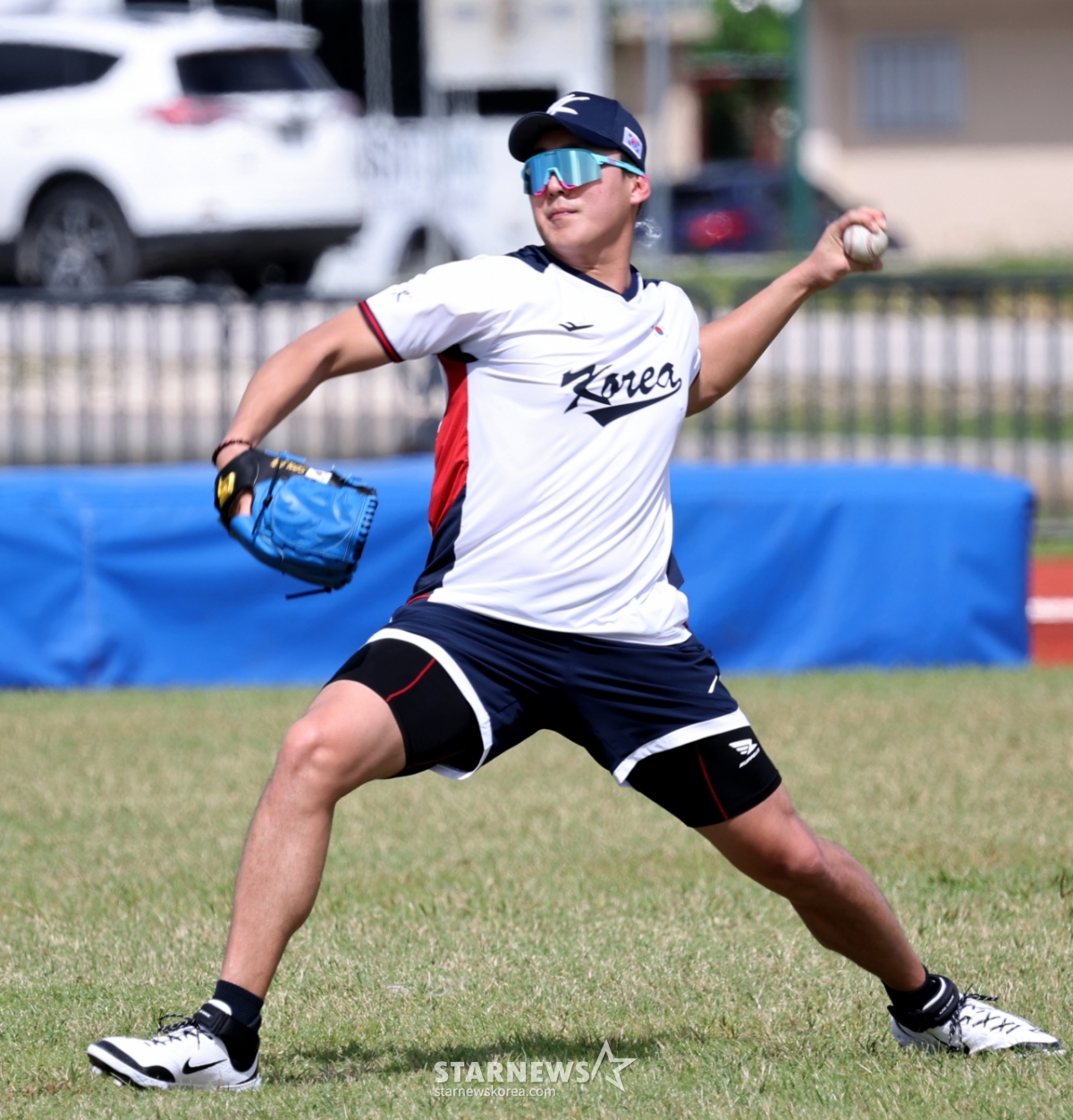 2026.01.10. 야구대표팀 투수 손주영이 사이판 올레아이 스포츠 컴플렉스에서 전지훈련 첫날 투수조 훈련에 참여하여 전력으로 피칭을 하고 있다.