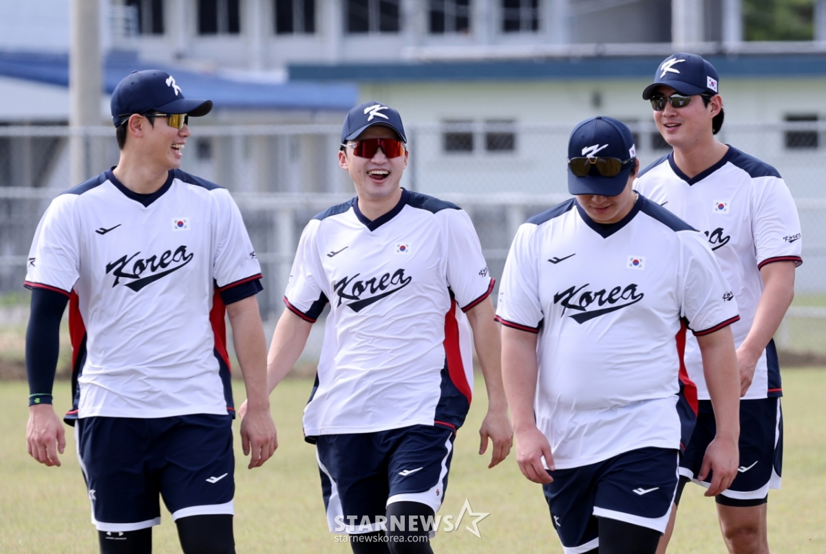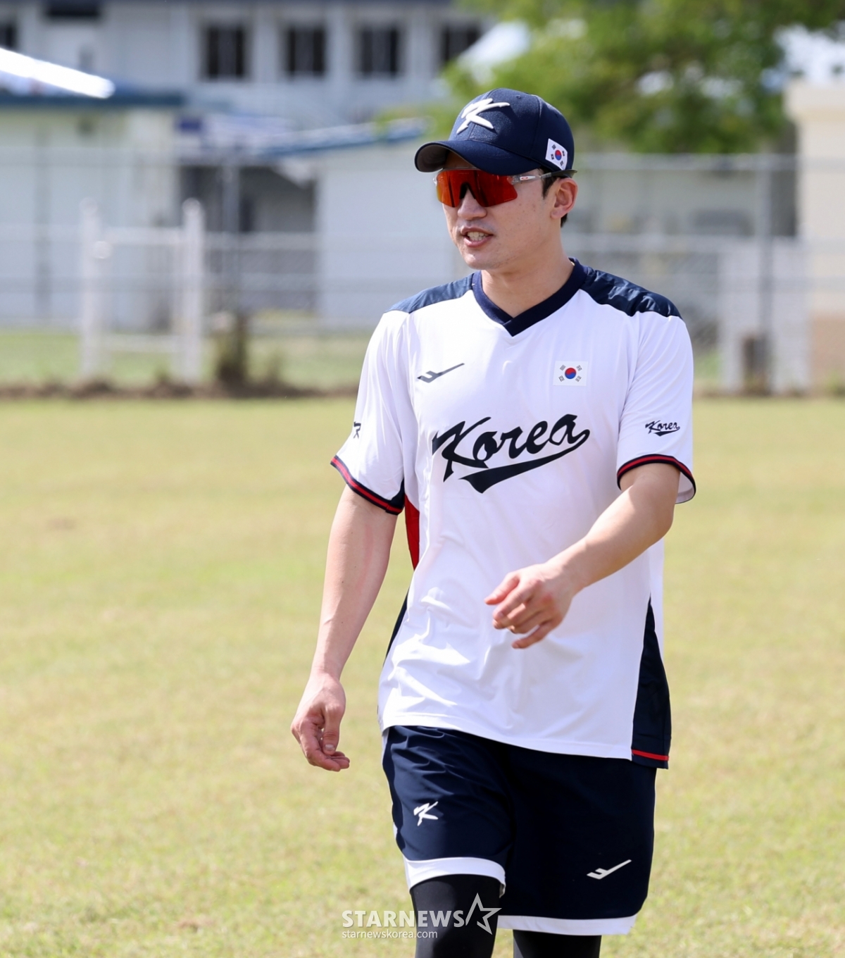 야구대표팀 야수조 캡틴 박해민이 10일 사이판 올레아이 스포츠 컴플렉스에서 열리는 전지훈련 첫날 몸풀기 훈련을 마무리하며 활짝 웃고 있다. 2026.01.10.