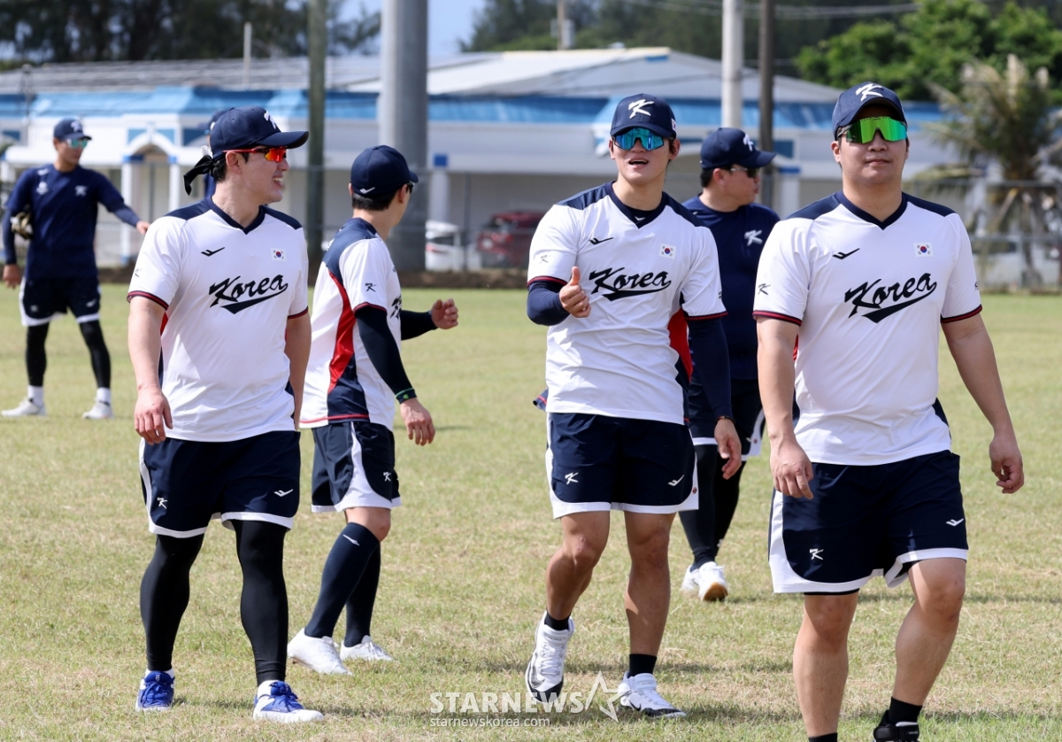 야구대표팀 김도영이 10일 사이판 올레아이 스포츠 컴플렉스에서 열리는 전지훈련 첫날 몸풀기 훈련을 마무리하며 박동원과 이야기를 나누고 있다. 2026.01.10.