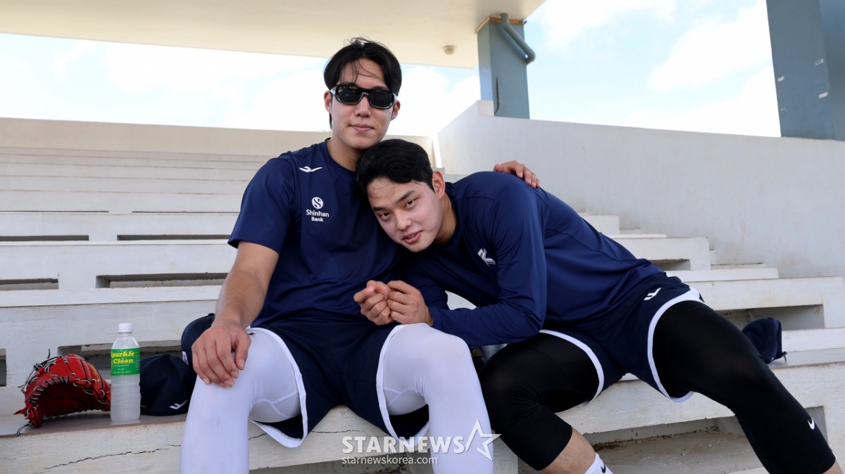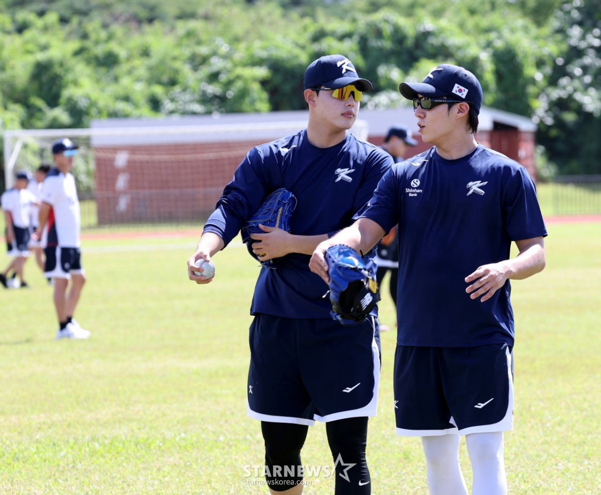야구대표팀 문동주와 원태인이 11일 사이판 올레아이 스포츠 컴플렉스에서 열리는 전지훈련 둘쨋날 오전훈련 중 잠시휴식을 취하던 중 이야기를 나누고 있다.