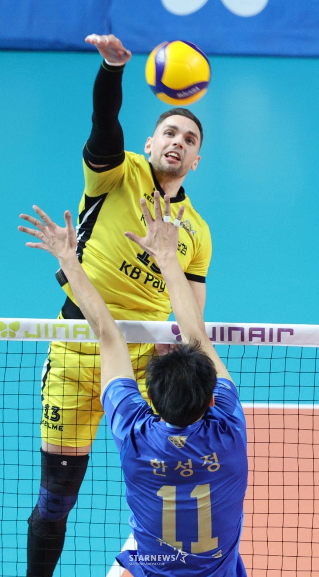 KB손해보험은 11일 서울 장충체육관에서 열린 진에어 2025~2026 V리그 남자부 4라운드 방문경기에서 우리카드에 세트 점수 3-1(25-17, 26-24, 21-25, 25-19)로 승리했다.