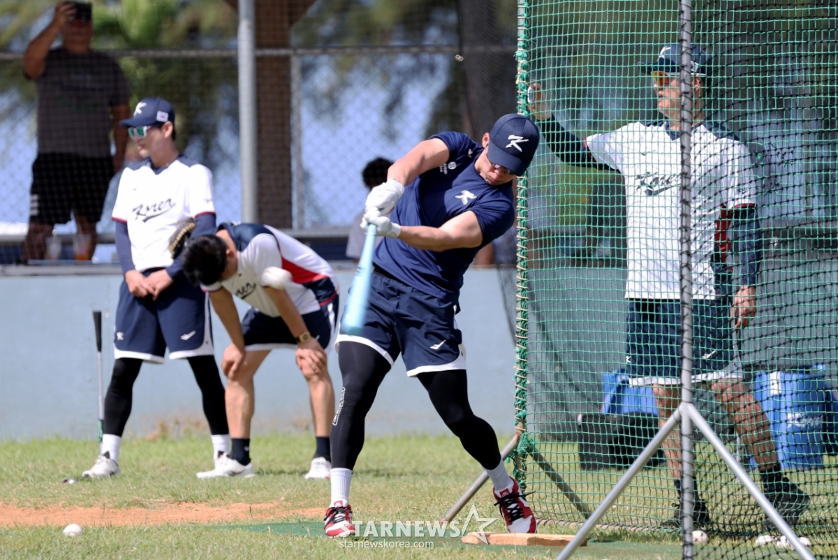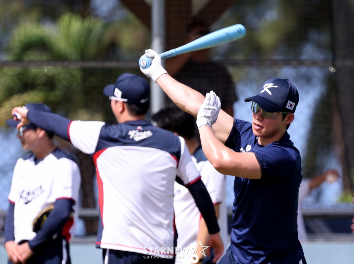 야구대표팀 김혜성이 11일 사이판 올레아이 스포츠 컴플렉스에서 열리는 전지훈련 둘쨋날 타격훈련 을 하고 있다. 2026.01.11.