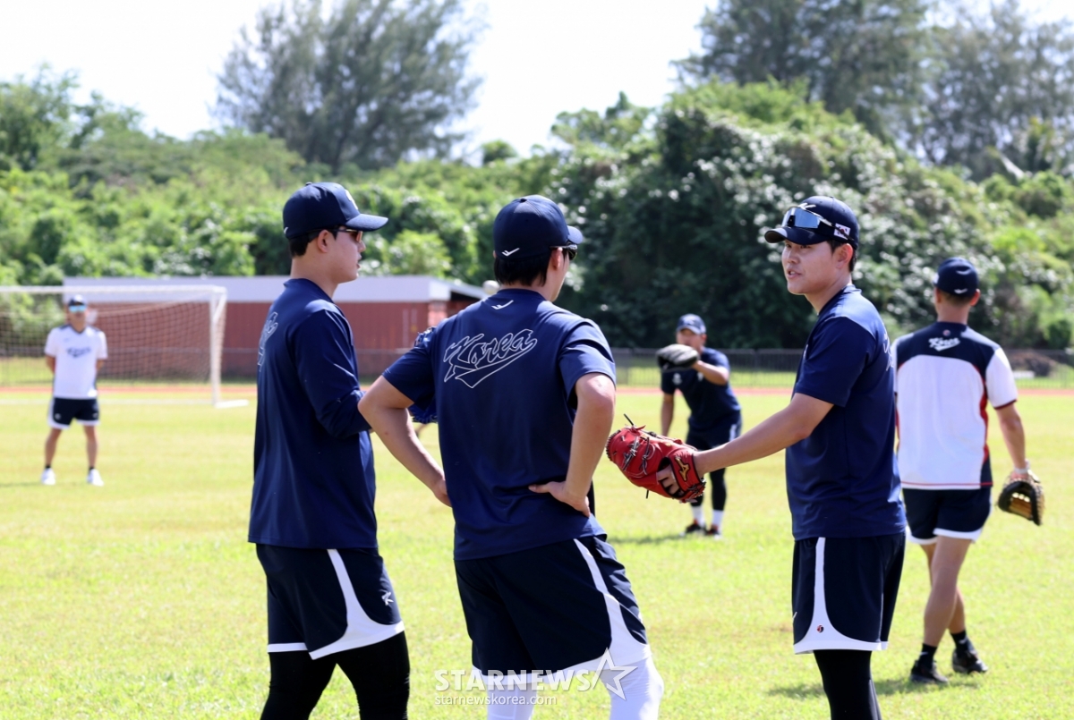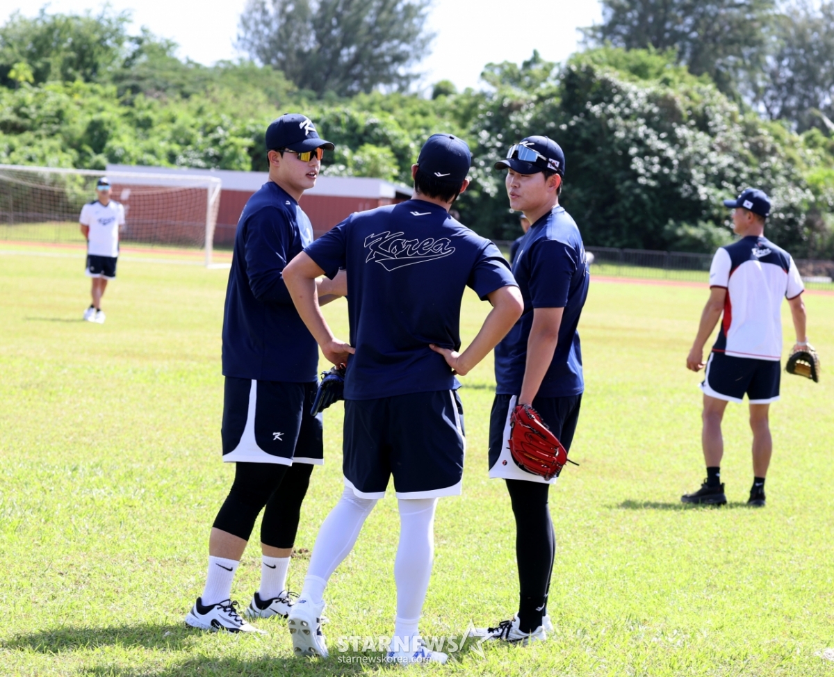 야구대표팀 원태인, 문동주,소형준이 11일 사이판 올레아이 스포츠 컴플렉스에서 열리는 전지훈련 둘쨋날 롱토스를 마무리한후 투구폼 대해 이야기를 나누고 있다. 2026.01.11.