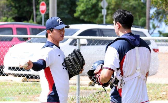 김광삼 코치는 줄곧 고우석 쪽에 붙어 있었다. 요령 있게 던지는 노경은과 달리 고우석은 누가봐도 전력으로 던지고 있었기 때문이다. 지켜보던 김 코치는 고우석을 진정시키며 조금은 힘을 빼고 던지라고 말했다. 하지만 고우석은 연신 전력투구를 펼쳤다.