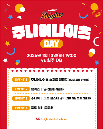 SK는 12일 보도자료를 통해 오는 13일 오후 7시 서울 잠실학생체육관에서 열리는 2025~2026시즌 KBL 정규리그 원주 DB와 홈경기를 '주니어 나이츠 데이'로 지정해 다채로운 이벤트를 개최한다.