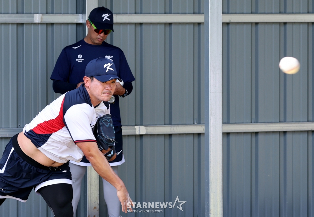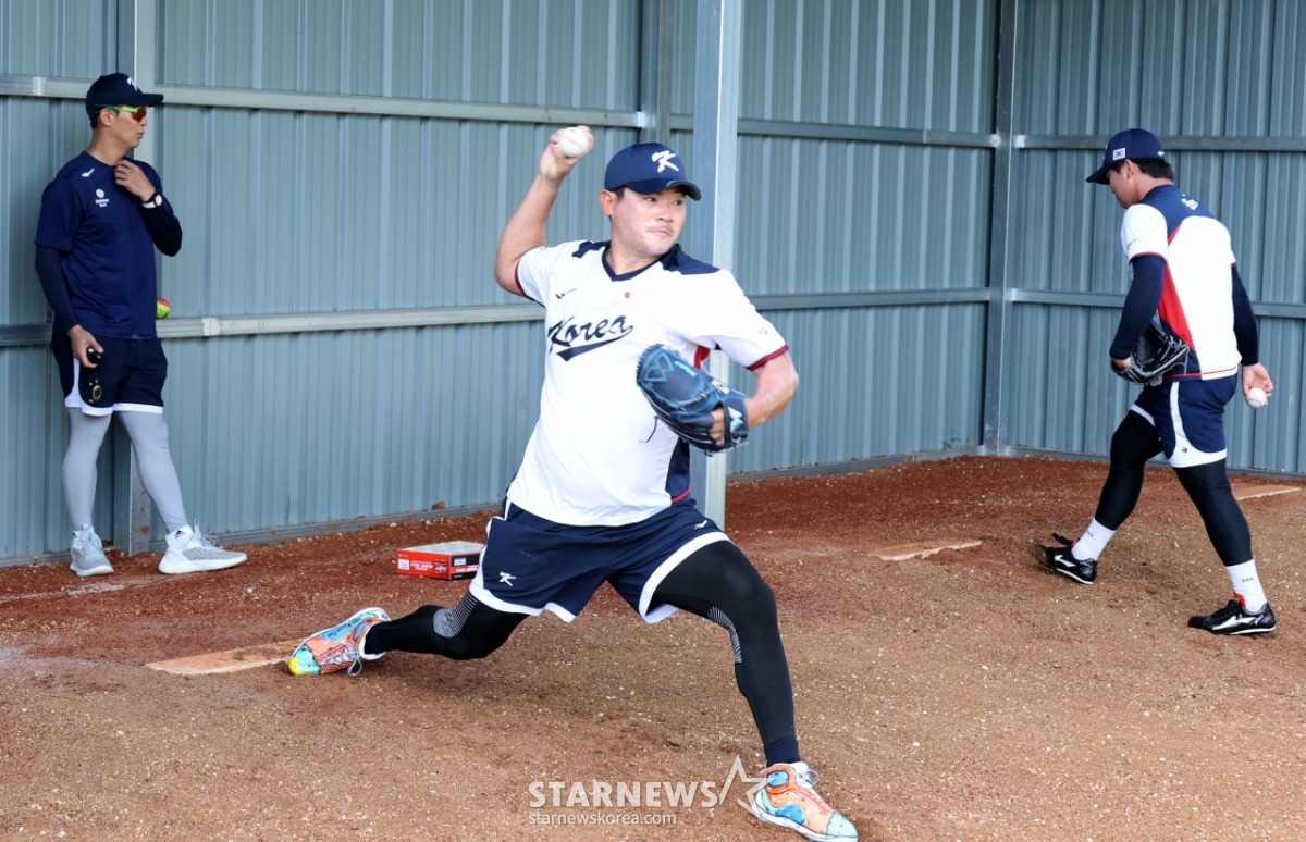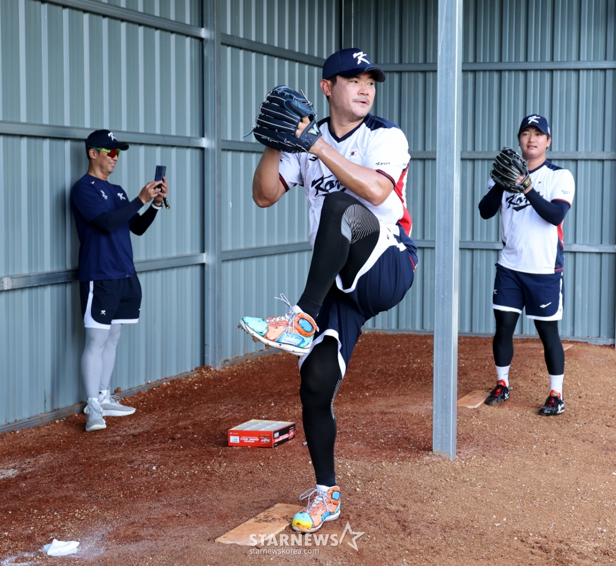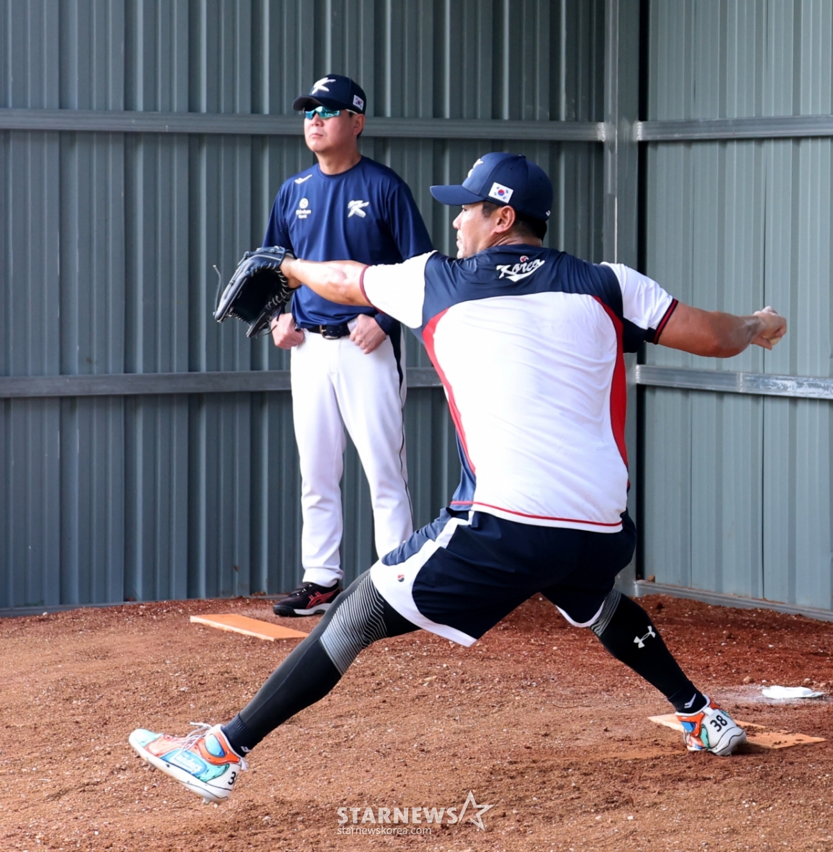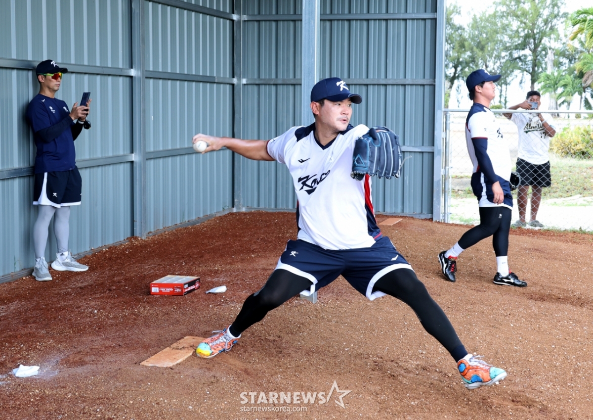 야구대표팀 투수 고우석과 노경은이 12일 사이판 올레아이 스포츠 컴플렉스에서 열리는 전지훈련 3일차훈련에서 불펜피칭을 하고 있다. 김광삼, 최원호 코치와 류지현 감독과 현장을 찾아 두 선수의 불펜피칭을 지켜봤다. 2026.01.12.