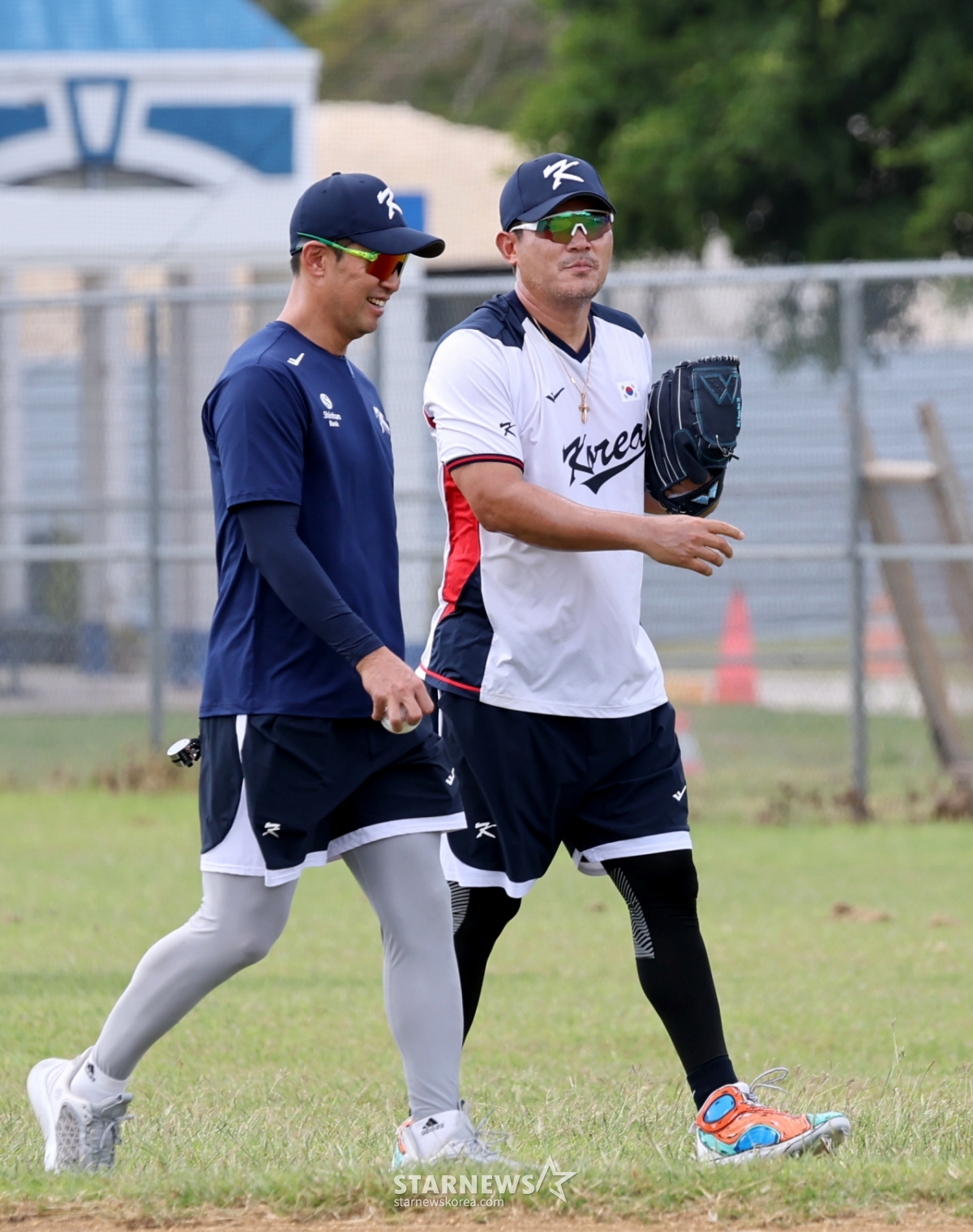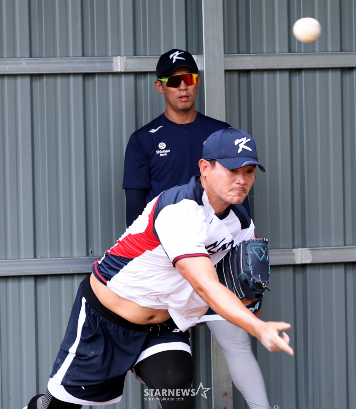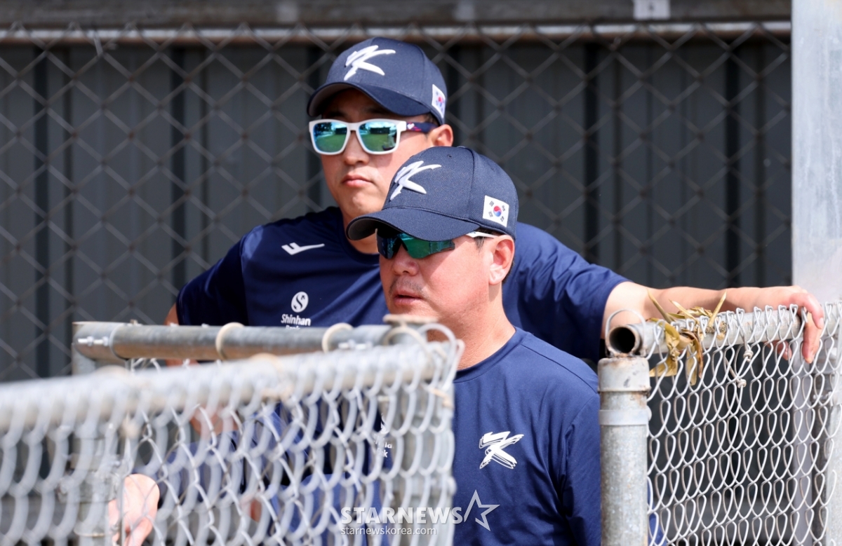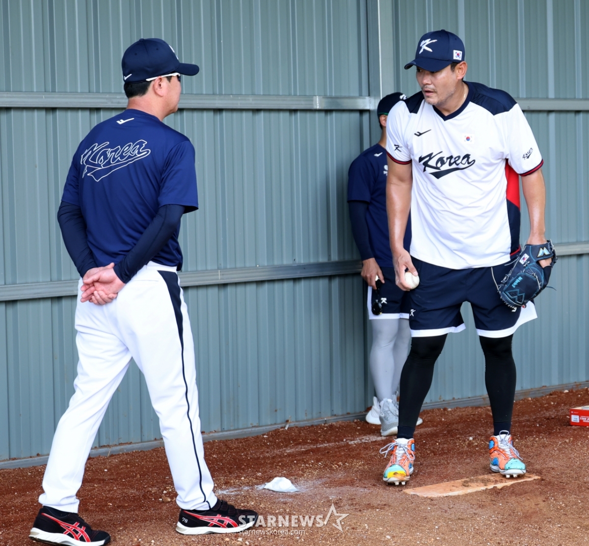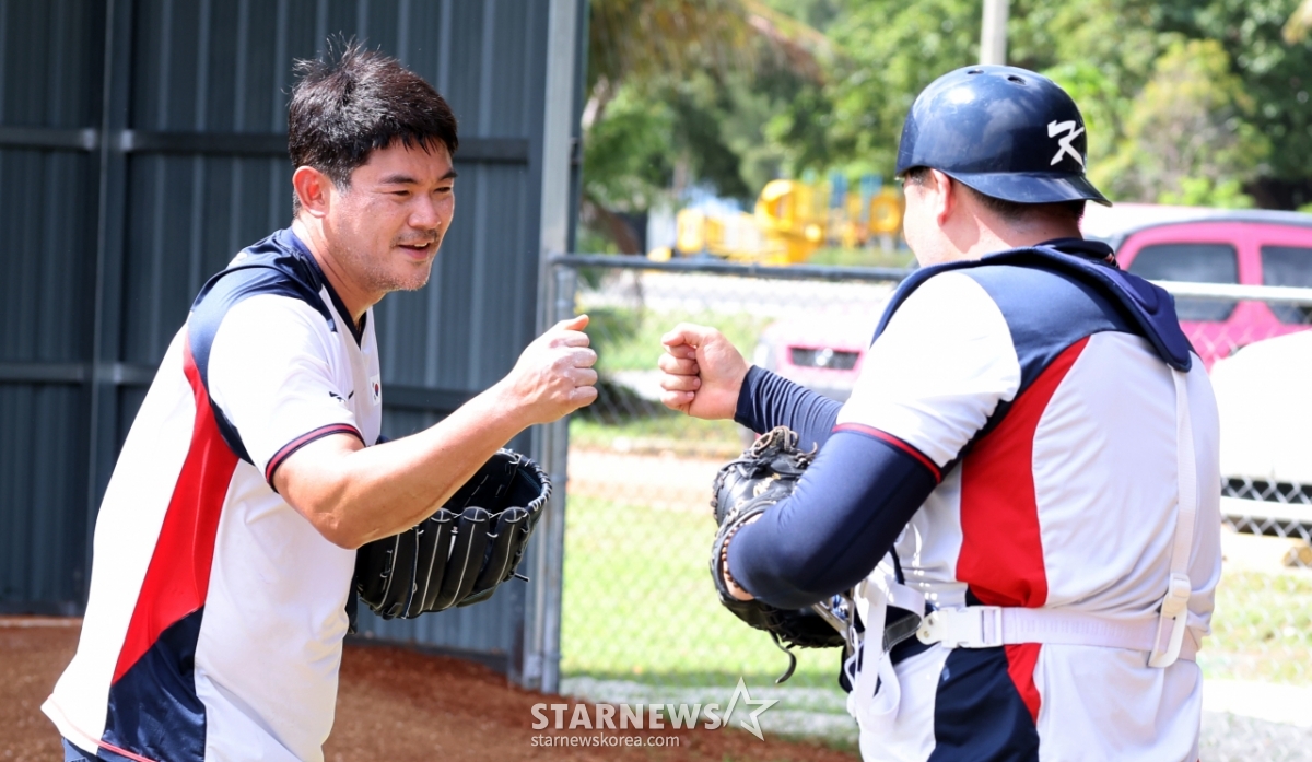 야구대표팀 투수 고우석과 노경은이 12일 사이판 올레아이 스포츠 컴플렉스에서 열리는 전지훈련 3일차훈련에서 불펜피칭을 하고 있다. 김광삼, 최원호 코치와 류지현 감독과 현장을 찾아 두 선수의 불펜피칭을 지켜봤다. 2026.01.12.