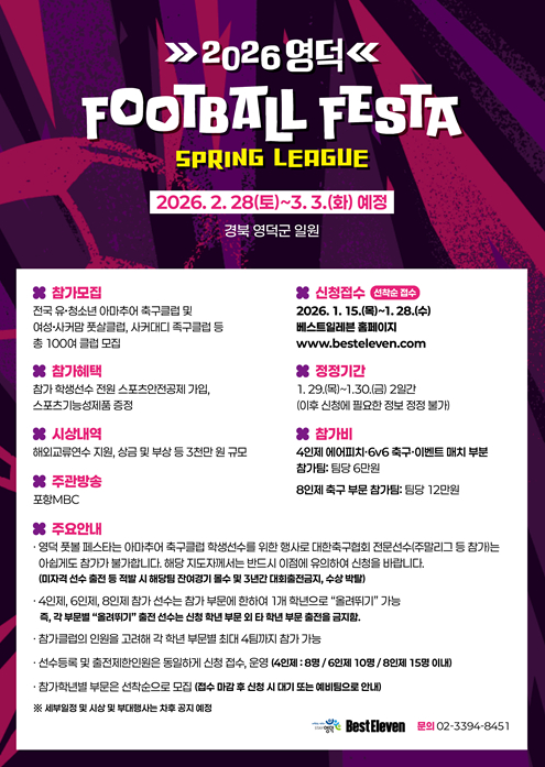 베스트일레븐은 "이번 스프링리그에는 축구 가족들이 함께 참여할 수 있는 다채로운 프로그램을 준비 중"이라며 "많은 축구 가족이 영덕군에 머무르며 훌륭한 인프라에서 축구를 즐기고, 지역 명소와 대표 먹거리인 대게도 즐기길 바란다"고 전했다.