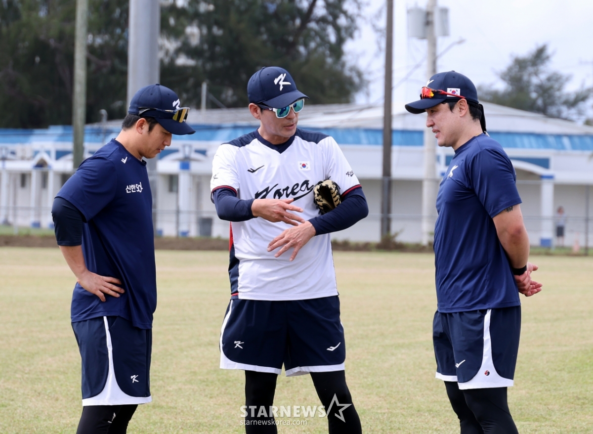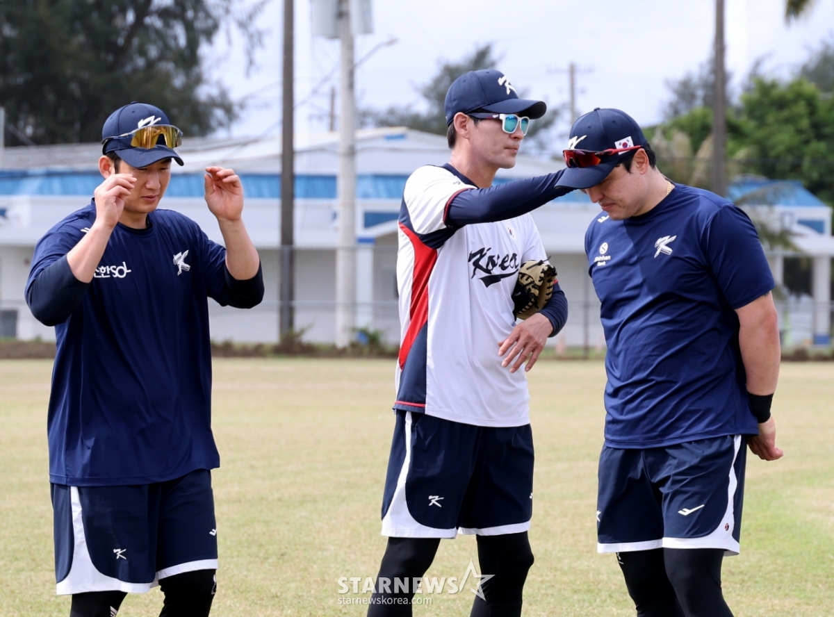 야구대표팀 강인권 코치와 포수 최재훈, 박동원이 14일 사이판 올레아이 스포츠 컴플렉스에서 열리는 5일차 훈련에서 이야기를 나누고 있다.
