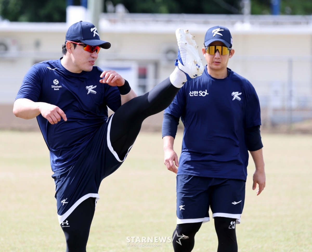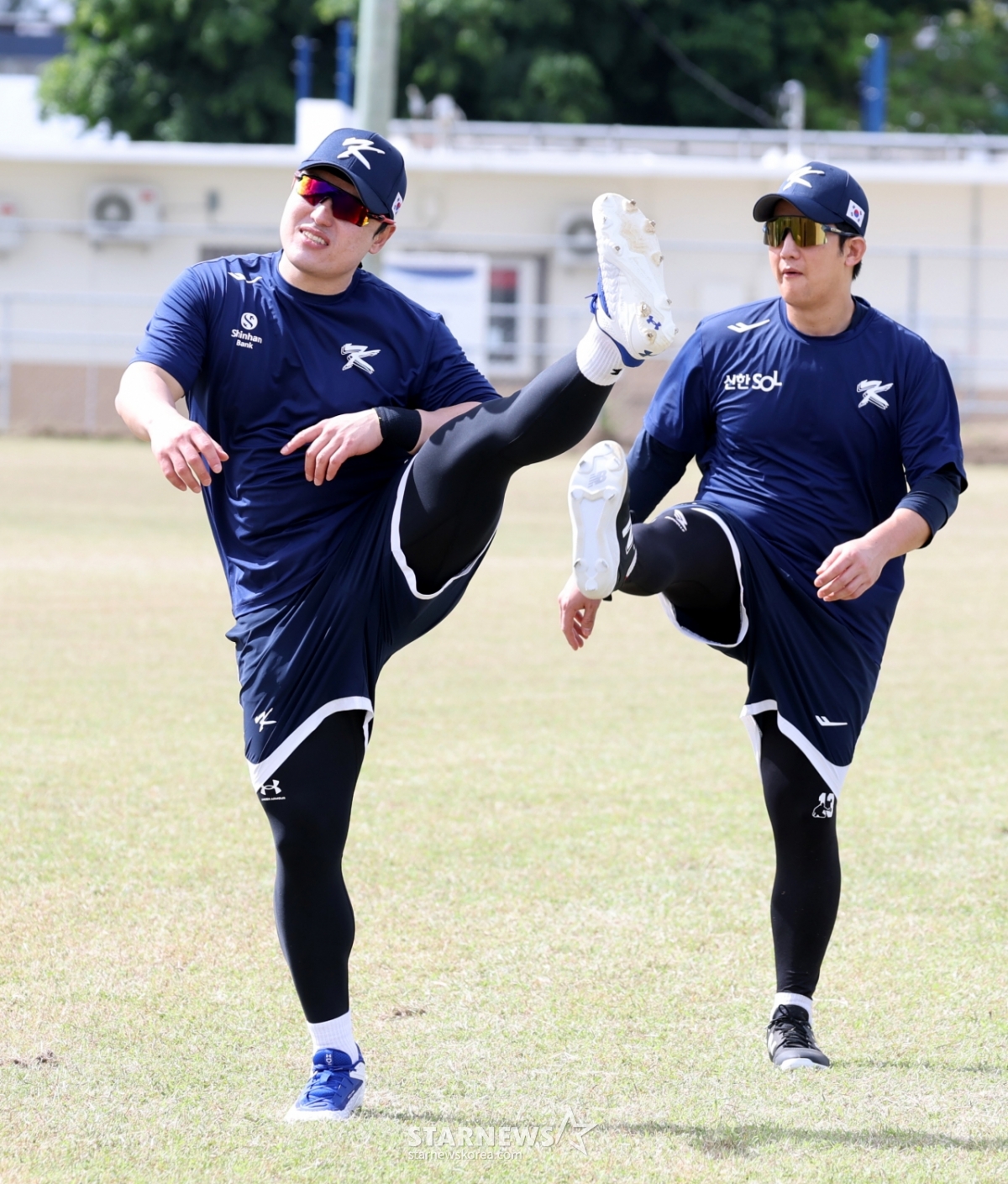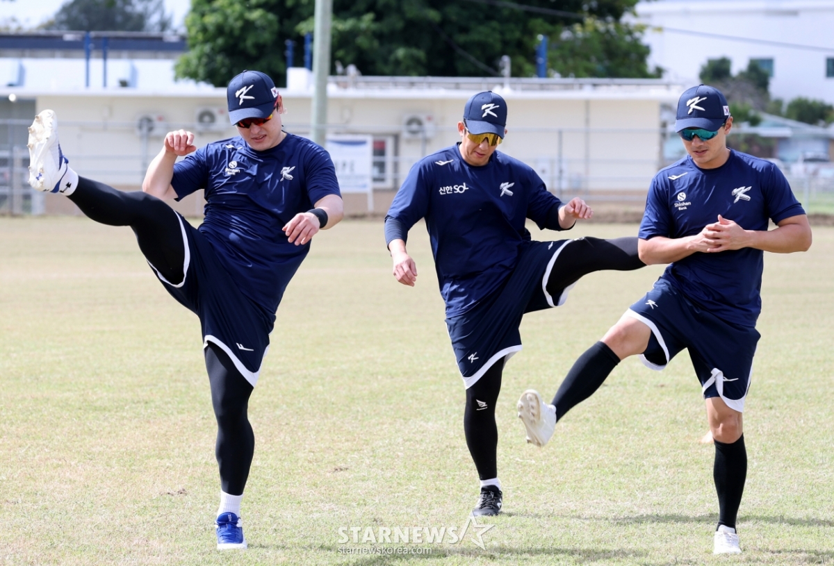 야구대표팀 포수 최재훈, 신민재, 박동원이 14일 사이판 올레아이 스포츠 컴플렉스에서 열리는 5일차 훈련에서 몸을 풀며 훈련을 시작하고 있다. 2026.01.14