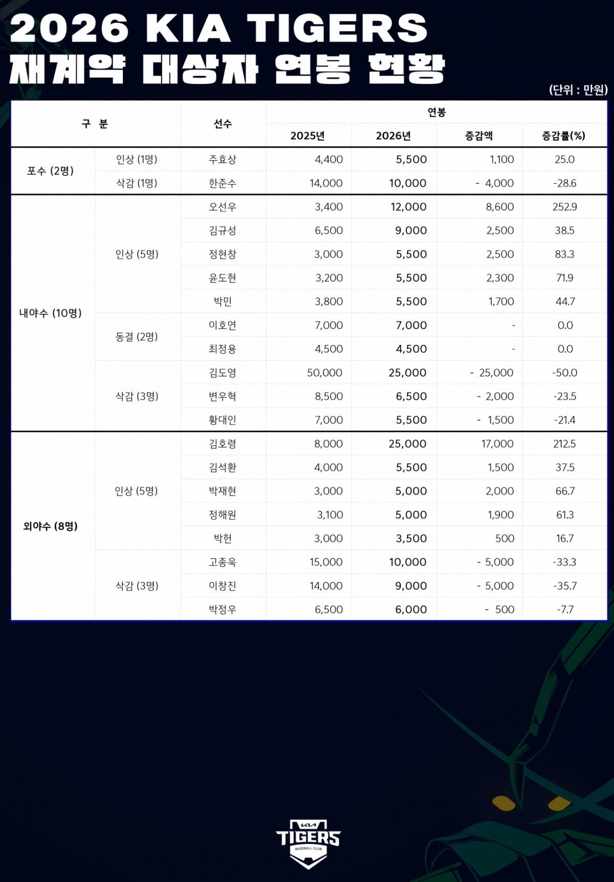 반면 내야수 오선우는 3400만원에서 무려 252.9%가 인상된 1억 2000만원에 재계약을 마쳤다. 이밖에 김규성은 9000만원에(38.5% 인상), 윤도현은 5500만원(71.9% 인상)에 도장을 찍었다. 외야수 김호령은 8000만원에서 212.5%가 오른 2억5000만원에 사인하며 야수 최고 연봉자에 이름을 올렸다. 포수 주효상도 1100만원이 인상된 5500만원에 재계약을 마쳤다.