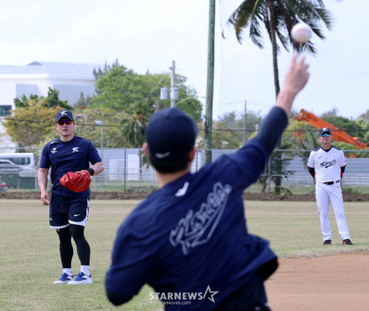 야구대표팀 박둥원이 14일 사이판 올레아이 스포츠 컴플렉스에서 열린 5일차 훈련에서 최재훈과 캐치볼을 하고 있으며, 류지현 감독이 지켜보고 있다.