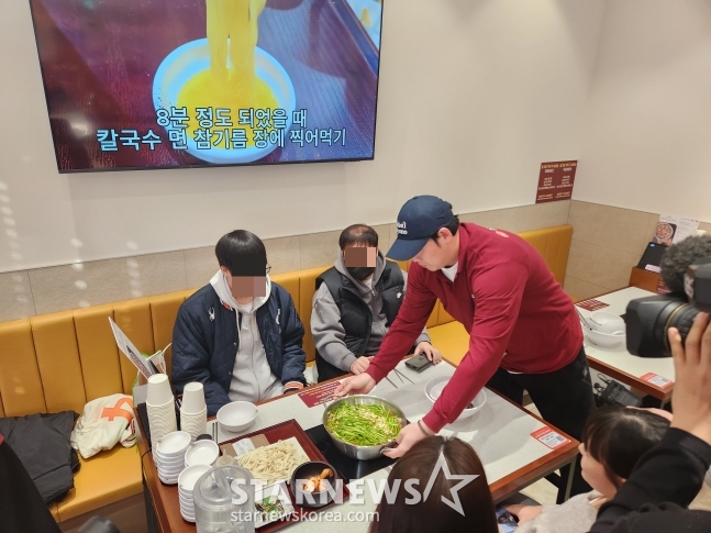 일이 서툰 선수들이기에 공약처럼 직접 칼국수를 만들어 대접하진 못했지만 서빙과 식사 후 볶음밥 제조엔 직접 나섰다. 오전 10시부터 1시간씩 총 6타임에 걸쳐 서비스가 진행됐다. 한 타임에 70여명이 1시간 가량씩 식사를 했다.