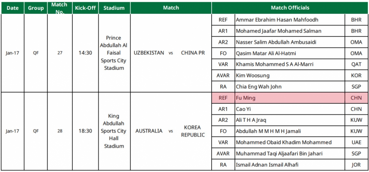 AFC는 오는 18일 오전 0시 30분(한국시간) 사우디아라비아 제다의 킹 압둘라 스포츠 시티 스타디움에서 열리는 한국-호주전을 중국 국적 푸밍 주심이 진행한다고 발표했다.