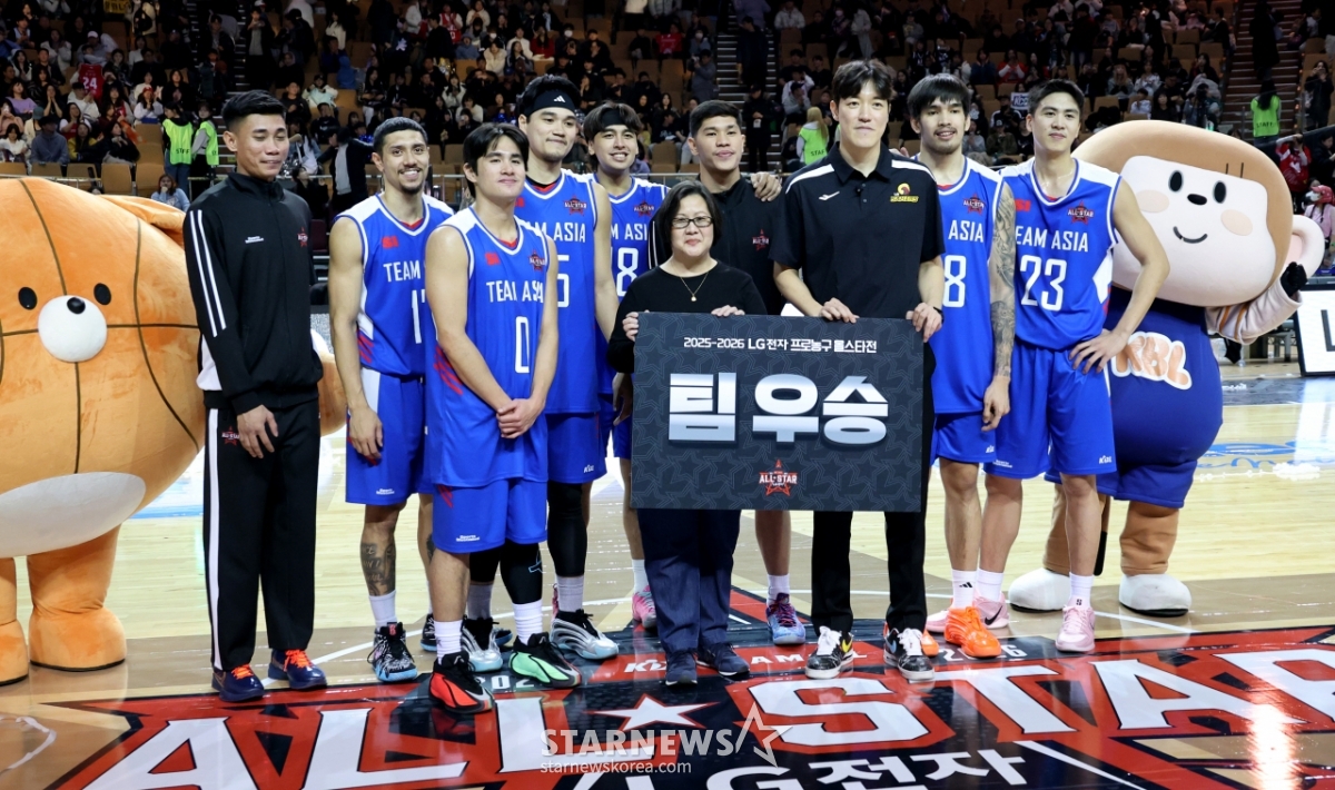 팀아시아 허일영 감독과 선수들이 17일 잠실실내체육관에서 열린 2025-2026 프로농구 올스타전 전야제 팀루키와 팀아시아 경기 에서 승리한 후 페르난데즈 주한필리핀 대사와 기념촬영을 하고 있다. 2026.01.17