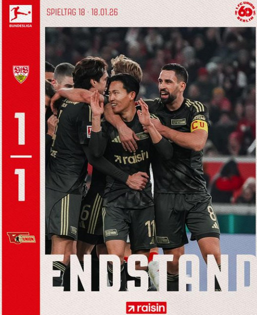 우니온 베를린은 18일(한국시간) 독일 MHP아레나에서 열린 슈투트가르트와의 '2025~2026시즌 독일 분데스리가' 18라운드 원정 경기에서 1-1로 비겼다.