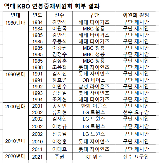 중재위원회 회부를 연도별로 살펴보면 감소 추세가 뚜렷하다. 1980년대 8건, 1990년대 5건, 2000년대 5건, 2010년대 2건, 2020년대 1건이다. 시간이 흐를수록 연봉 중재 제도는 사실상 '사문화'하는 분위기다.