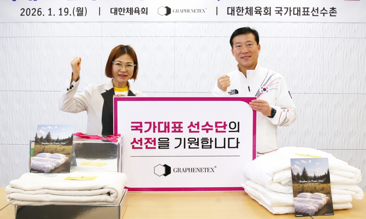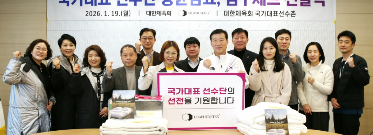 대한체육회(회장 유승민)가 19일 오전 11시 진천 국가대표선수촌에서 그래핀올과 총 1790만 원 상당의 리버커리담요 외 패브릭 제품 전달식을 개최했다.