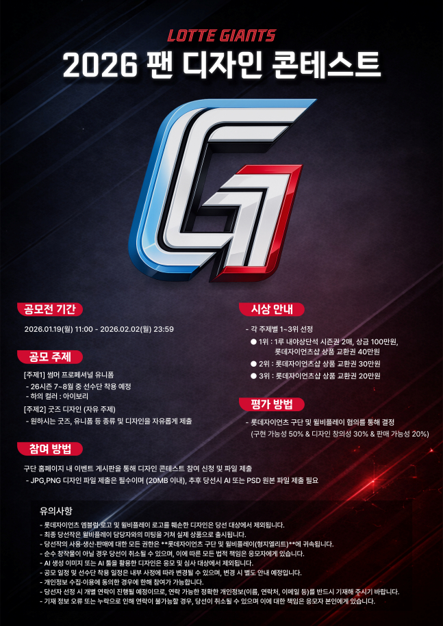 롯데 구단은 "팬들이 시즌 유니폼과 굿즈 제작 과정에 참여하는 '2026 팬 디자인 콘테스트'를 진행한다"고 16일 밝혔다.