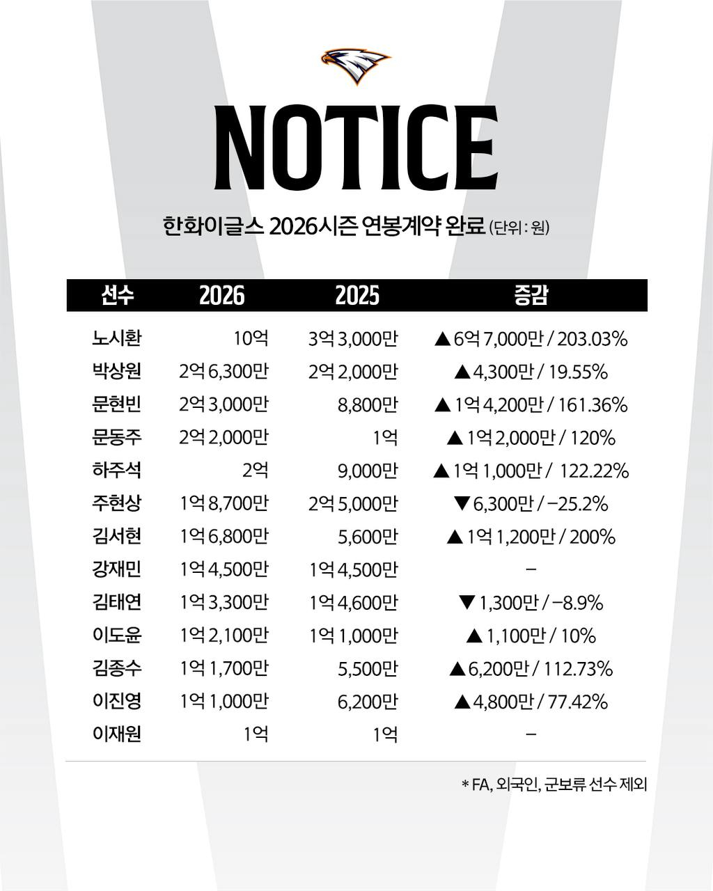 한화 이글스가 드디어 2026시즌 연봉 계약을 모두 마무리 지었다.